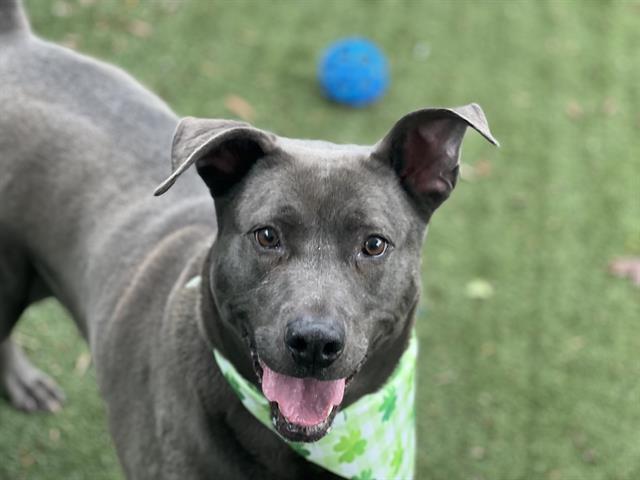 -Funny, chunky, handsome silver fox-Soft coat-LOVES the play yard and ANY toy (does not discriminate among tennis balls, rope toys or stuffies)-Good on leash despite size-Saw other dogs walking by with no reaction-Happy guy, enjoys pets-Knows sit and is very treat motivated