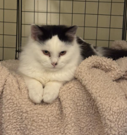 Please meet Ghost! Ghost says, ‘I am a handsome boy, calm, sweet and a bit cautious. I warm up with lots of love. I’ve been around dogs and other cats and have done fine.’ Ghost is about 6 months old as of 12/13/2025, and his fur is silky white and black. He is microchipped. He and his brothers Spirit and Goblin are playing with their foster family. Please submit our no-obligation Adoption Application for a meet and greet or to adopt: https://forgottencats.org/adoption-application/. Thank you! (Foster Deborah C.)