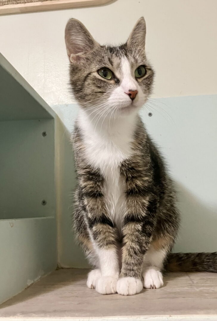 Meet Glitter (aka Glitter Bean) – The Sweetheart with the Softest Eyes and the Biggest Purr. Glitter is a young mama who’s wrapped up her parenting duties and is now ready to be someone’s beloved companion. With her soft tabby stripes, white socks, and gentle green eyes, Glitter is as lovely on the outside as she is on the inside. A little shy at first, she quickly blossoms into a cuddly, talkative purr-machine who adores human attention. One of her absolute favorite things? Brush time. She melts under a gentle grooming session, happily soaking up every stroke like the pampered queen she was meant to be. Glitter also has a playful side and lights up during toy time—she’s especially into batting and chasing, and it’s clear she missed out on some kitten play while being a mama. She’s making up for it now with enthusiasm! Glitter enjoys the company of other cats and would do great with a friendly feline companion. She's not a fan of dogs, though—her foster home's Chihuahua just isn’t her vibe. If you're looking for a loyal, loving cat who will return your affection with purrs, chatter, nose to nose kisses and plenty of head boops, Glitter is your girl. DOB: 5/27/2023 ** Come meet me at the cage free adoption center! All cats are spayed or neutered, vaccinated and tested for FIV/FeLV. **If interested in adopting me, please fill out an online adoption application at https://colonycats.org/adoption_app.html to expedite the process. Due to the large number of inquiries received, we are unable to respond to emails quickly.**