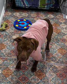 See Glizzy- petite sweetheart’s HomepageGo to our official websiteYou can fill out an adoption application online on our official website. Look at this sweetheart! Glizzy is beautiful chocolate brown petite pittie soaking up all the love in her NJ foster home- now she's ready to find her forever family. Glizzy has a heart full of love. At 3 years old and 27 pounds, she's dog and kid friendly making her the perfect addition to any home. Glizzy is house trained and will alert you when she has to go out. She is calm yet playful, she's a small girl with a big heart who loves to cuddle and be by your side, Sweet, happy and loving, Glizzy is the perfect companion! Glizzy is fixed, microchipped and up to date on vaccines. She is currently undergoing treatment for heartworm. She can come to NJ in August if we find a foster or adopter to help her through his treatment (2 visits to our vet and 4 weeks of rest) or she can come in October after treatment is completed. Her adoption fee is $450. Adopting a dog is a commitment that will require annual veterinary care at a minimum, training, exercise, enrichment, etc. Pet care is not cheap or easy and adopters should consider the costs, time and training prior to adoption. After all these dogs have been through they deserve a loving, committed home. Apply to foster or adopt @ wagoninn.rescuegroups.org
