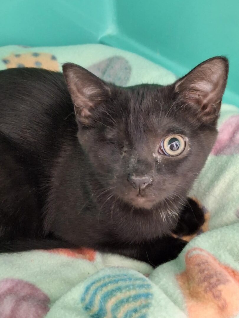 Gobble – Male DOB 10/22/2024 Domestic Short Hair – Black Meet Gobble—the sweetest, most lovable one-eyed black panther you'll ever meet. This little guy may have had a rough start in life, losing his eye to an untreated infection as a kitten, but you'd never know it by the way he melts into your arms. Pick him up, and he'll nestle his head right under your chin, pressing into your neck like he's known you forever. But don't let his snuggly side fool you—Gobble is all boy when it comes to playtime! He's a rough-and-tumble wrestler who loves a good kitten smackdown with his buddies, chasing spring toys, and batting balls around the room. He'll need to go home with another kitten who can keep up with his playful antics or a young, energetic cat who doesn't mind a bit of friendly wrestling. Gobble can be a little shy initially in a new space, so he'll need a few days to settle in. But once he's comfortable, his sweet personality shines. A calm, cat-savvy dog might be okay with a slow introduction, and he'd do best with older children who understand his need for gentle care. If you're looking for a kitten who's just the right mix of playful and sweet, Gobble's your guy. He's got a big personality, a soft spot for wrestling matches, and an even softer spot for snuggling right into your neck. Honestly, he's pretty sure that's the best place to be. Please apply via our easy online application at https://furrr.org/cat-adoption-process/All kitten(s) and cat(s) at FuRRR Feline Rescue are spayed/neutered, up to date on vaccinations for their age, combo tested for FIV/FeLV, microchipped and have a Health Certificate from a licensed NH veterinarian. Our application is available to be completed online at https://furrr.org/cat-adoption-process/ Applying DOES NOT guarantee approval. We hold meet and greets with approved applications only. (Kittens are available for adoption in pairs only unless they are going home to another kitten or young cat under 3) Our policy is strictly NO DECLAWING and INDOOR ONLY. Adoption fees: Kitten to 1 yr – $300 Kitten pairs $550 Adult cat 1+ yr to 8 yr – $200 Adult pairs $350 Cat 8+ – $75