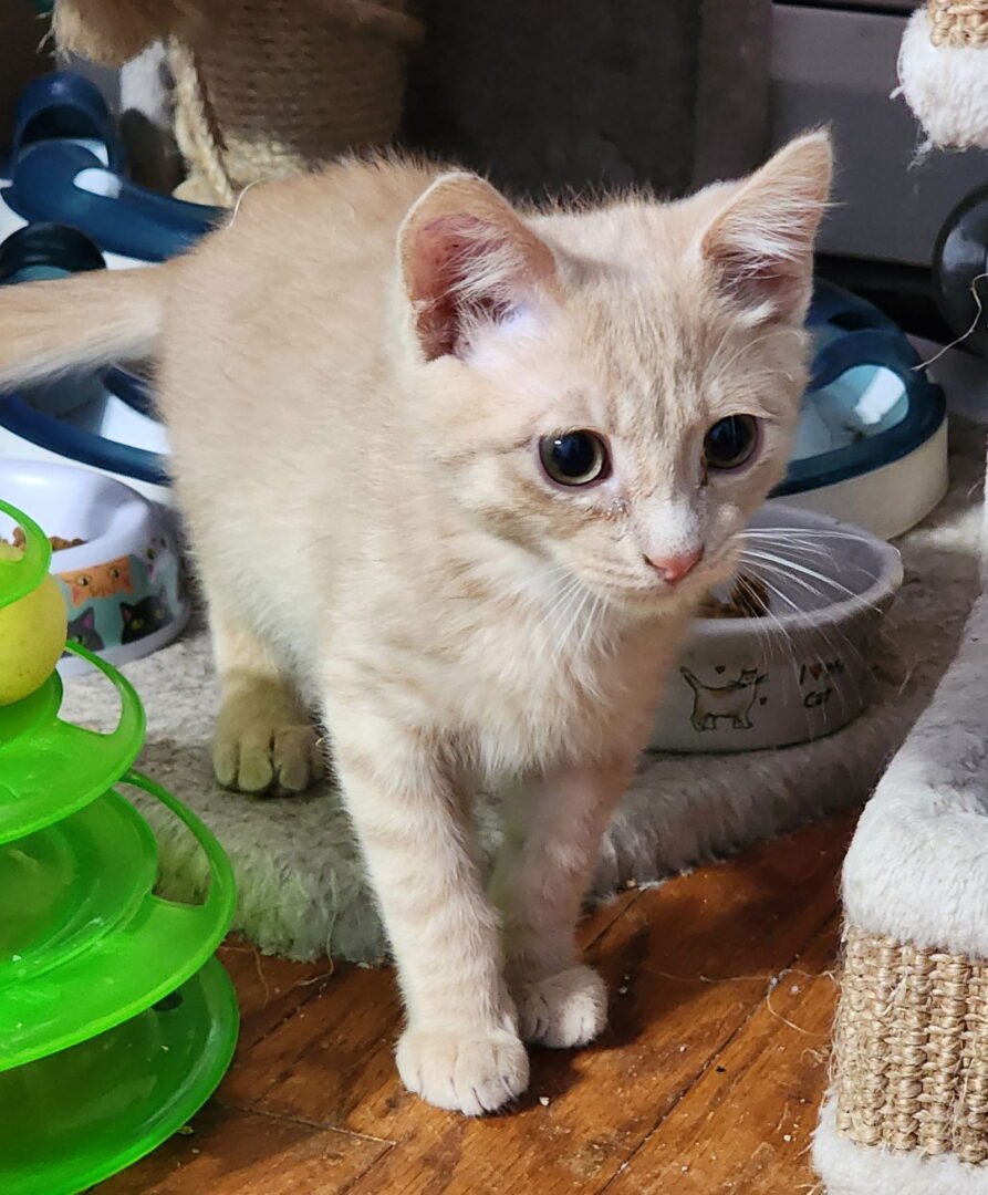 Purr-Machine!! Gobi is nearly always purring. And if he’s not just run your hand down his back and up his tail and you will activate his purr motor. He’s a very happy kitten. Gobi loves chasing balls especially the ones he can pick up in his mouth and carry around. He loves playing with his human so make time in your schedule for playtime. he’ll chase you all around the house as you drag the shoe string. You’ll get your cardio workout and your kitten will be extra happy. And when you tire out he’ll keep going. So toss his other toys and he will chase after them. When he’s done playing he’ll curl up on the couch next to you for a nap. Gobi prefers to cuddle up in a bed or on a soft blanket with another cat or kitten. Gobi has no experience with children or dogs. Gobi is playing with his foster family. Please submit our no-obligation application for a meet and greet or to adopt: https://forgottencats.org/adoption-application/. (Foster: Tracy Jo D.)