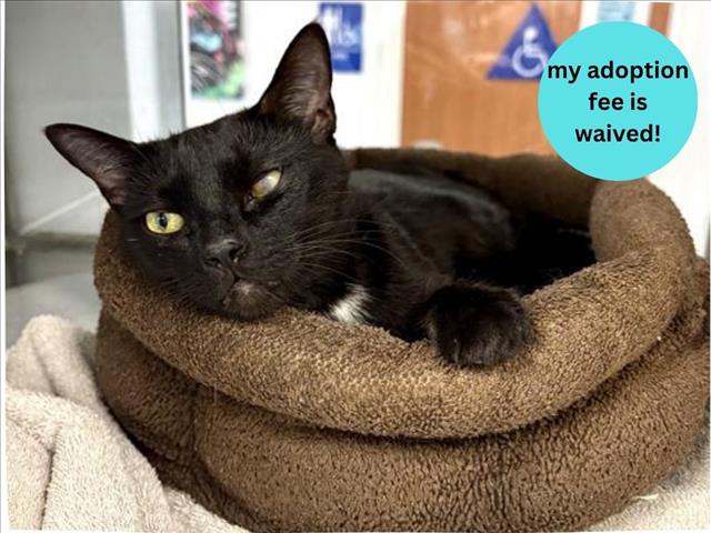 Take a dive into the underwater world and come look at GOGGLES. GOGGLES swam into the shelter with seven puddle jumpers (her kittens). She has swam a few laps here at the shelter, living on vacation time waiting for her perfect home. We know that GOGGLES has lived in a home with other animals and prefers to be matched with feline friends who are mellow and keep to themselves, rather than sinking in and becoming their best friend. GOGGLES has something unique about her, her eyes! Due to her special circumstances, GOGGLES needs to be indoor only in her new home. GOGGLES is confident, handleable, and playful. GOGGLES would do well in a variety of homes. She would do great as a best friend, a companion to a family, a welcome-home-committee, or cuddle bug. GOGGLES is regularly seen lounging in her fuzzy cat bed, when not soliciting affection from staff and volunteers. GOGGLES’ adoption fee is sponsored by the Santa Cruz County Animal Shelter Foundation thanks to the “Leave No One Behind fund” – a fund that draws adopter’s eyes towards animals who have been in the Shelter’s care a little longer than average waiting for the right adopter to call their best friend.Please note: Our Santa Cruz location’s Shelter hours are 11-6pm, 7 days a week! Although clients can walk through and see any animals in their kennels during open hours, we end “meet and greets” (aka meeting an animal out of the kennel) at 4:30pm every day. If you’d like to meet an animal out of the kennel, please arrive before 4:00pm to allow for time to discuss individual animals and meet them.
