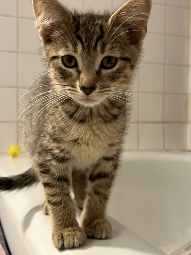 Meet Golden Boy — a silky sweetheart ready to steal your heart! Golden Boy is a stunning little kitten with soft, silky fur adorned in beautiful tiger stripes. But his most adorable feature? When you start to pet him, he immediately rolls over to proudly show off the charming chevron pattern on his belly—an irresistibly cute invitation for more love. This handsome boy is as affectionate as they come. He loves to snuggle close, nuzzle your hands, and settle in for a cozy cuddle session. With a purr that starts the moment he sees you and tiny paws that can’t help but make biscuits, Golden Boy radiates warmth and charm. Beyond his striking looks, he’s a truly loving kitten who thrives on companionship and gentle affection. He’s ready to bring joy, comfort, and endless sweetness into a home that will cherish him. If you’re looking for a devoted little companion with a heart of gold, Golden Boy is waiting to be your new best friend. I’d like to encourage people to consider adopting Golden with his brother Bruno (tabby in one of the pix). My second choice would be his sister Lil Bit He’ll be fine by himself, but his siblings bring out the best in him! (Note: Tux sister Melody was adopted). Siblings Lil Bit, Golden Boy and Bruno are playing with their foster family. Please submit our no-obligation adoption application for a meet and greet or to adopt: https://forgottencats.org/adoption-application/ . Thank you! (Foster: Nancy P.)