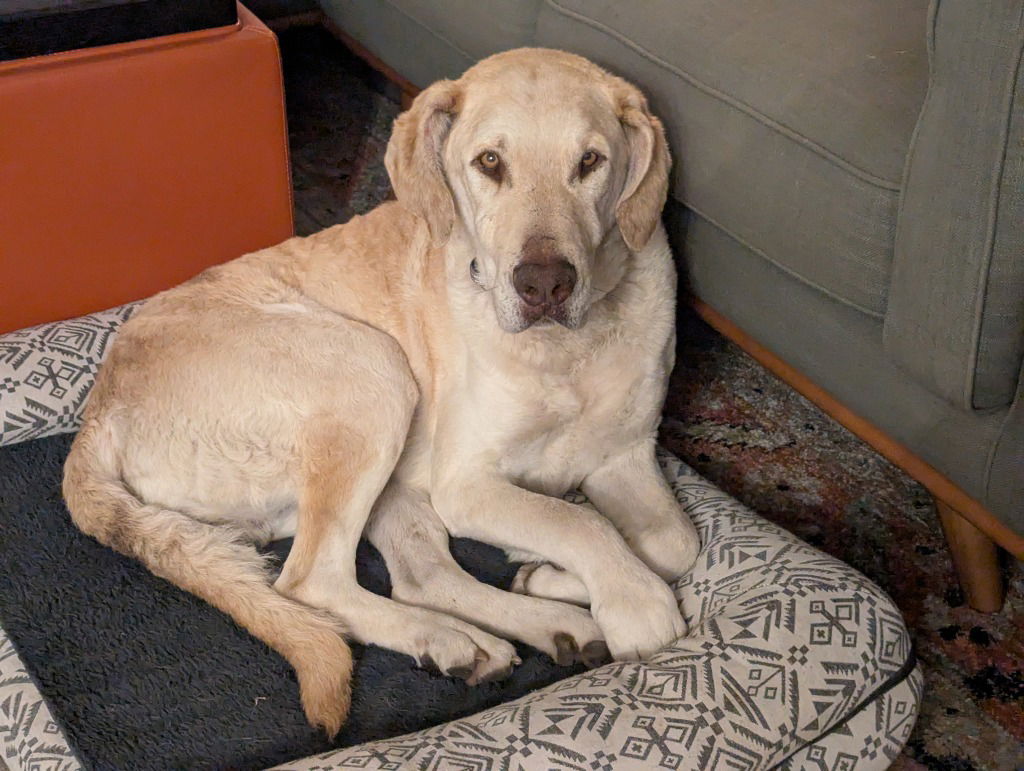 Meet Goose An 8-year-old, 70-pound Retriever/Poodle mix with a heart as soft as his curls and the sweetest, most sincere personality you could hope for.Goose is a gentle, easy-going soul who has settled beautifully into home life. He’s house-trained, crate-trained, and walks wonderfully on a loose leash. Big sounds can make him a little jumpy, but he stays polite and calm—even when he’s unsure.This sweet boy’s favorite thing in the world is a good head scratch. He’ll rest his big head on your lap, stare up at you with his warm topaz eyes, and let you know just how much he loves you. When he’s not soaking up affection, Goose enjoys sunbathing, snuggling a soft toy, or simply lounging nearby.Goose has medium energy and low exercise needs—just a short daily walk and a few minutes of fetch keep him perfectly content. He’s quiet, respectful, and would do well in a house or an apartment (a yard is a bonus but not required). He’s good with other dogs and would enjoy having a calm companion, though he’s also perfectly happy being your one and only. He’s great with kids 5 and up due to his size and enthusiastic paw-giving.This lovable, slightly derpy guy has long legs, a sweet disposition, and a deeply affectionate nature that makes him truly special. After recovering from a past lung infection, he’s doing wonderfully—just an occasional light cough that continues to improve.If you’re looking for a gentle, devoted companion who is happiest with a comfy bed, some sunshine, and plenty of head scratches, Goose might just be the perfect match. Dogs are not placed on a first-come, first-serve basis. We strive to find the perfect home for each animal. Applications may take up to 48 hours to process. All CAWS animals are fixed, microchipped, and vaccinated. His adoption fee is $200. If you are interested in adopting a CAWS pet, please fill out an online application at http://caws.org/adoption-application If you are interested in adopting a CAWS pet, please fill out an online application at https://caws.org/adoption-application