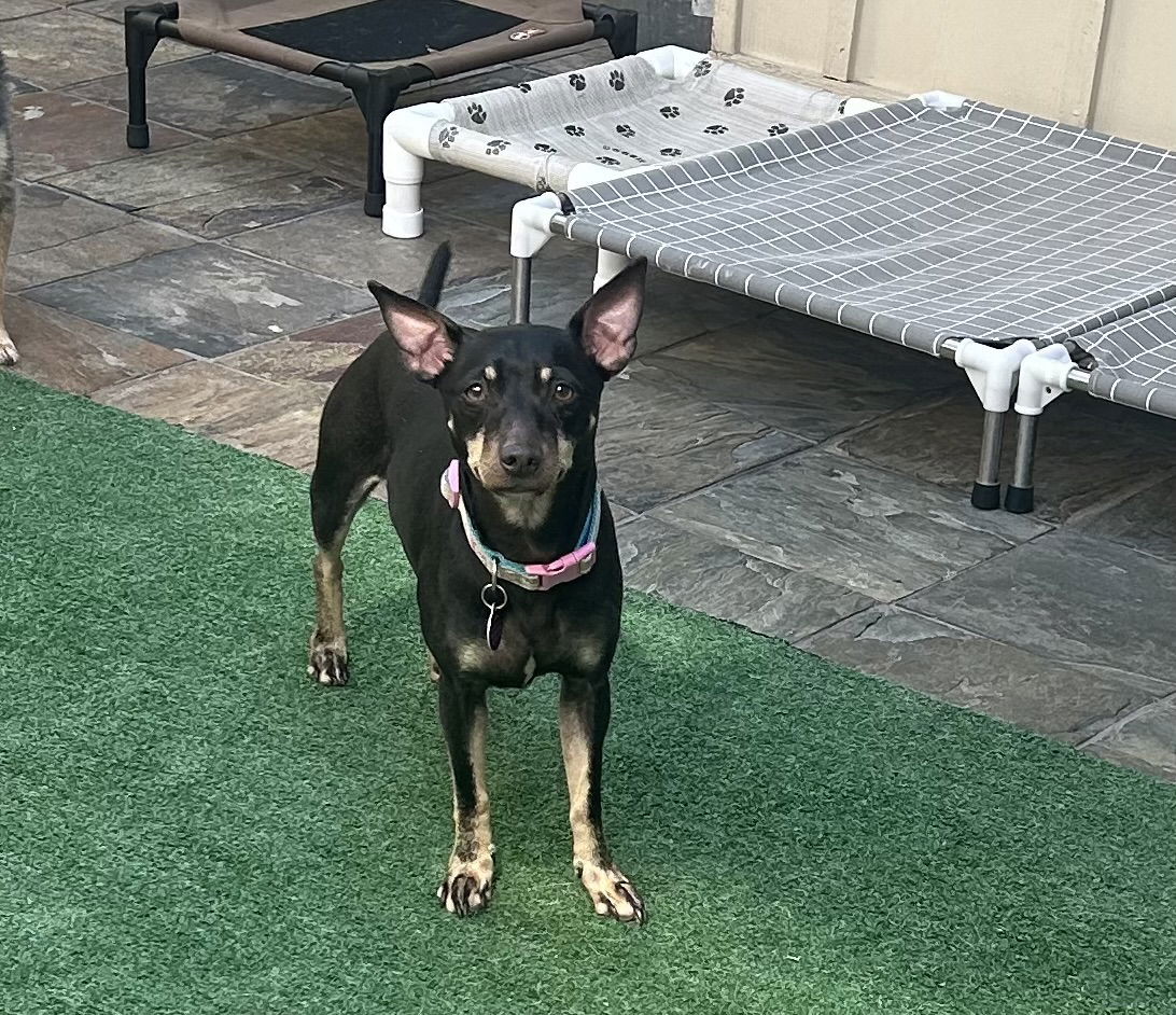 Est. DOB: 1/1/2020, spayed, up to date on vaccines, microchipped, heartworm negative, approximately 22 lbs Meet Gorgeous! She first came to our rescue at just six weeks old, was adopted, but sadly returned to us four years later through no fault of her own. We believe she’s a Miniature Pinscher mix, and now she’s looking for her forever home once again. Gorgeous gets along well with other dogs in her foster home and has even lived with cats, though she might give them a playful chase. She’s an incredibly affectionate dog who loves to cuddle with her people. Gorgeous is leash, kennel, and potty trained, and she also knows how to use potty pads. For her comfort, she needs regular access to a patio and thrives in a home where she won’t be left alone for long hours. Gorgeous would do best in a home with other dogs. If you’re looking for a loyal, loving companion, Gorgeous could be the perfect match! Please consider making this adorable girl a member of your family. As we are a foster based rescue, we do require a completed application to be submitted before we arrange a meet. This can be found on our website at : https://almosthomepetrescue.org/apply-now-1 $200 adoption fee includes core vaccinations, rabies vaccination, heart worm test (in dogs over 6 months of age), microchip and registration, spay/neuter, wormer and flea and heart worm prevention while the dog is in our care. All breed and size categorizations are estimates. If transporting out of state, the total adoption cost will be $500. This amount is inclusive of adoption fee, transport fee, health certificate, and taxes.