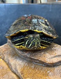 Hi there my name is Gouda. I am a red-eared slider. Red-eared sliders are aquatic turtles but do like to spend some time basking out of the water. Adults are omnivores, they eat plant matter as well as small animals such as worms and other bugs. Adult sliders will do better in ponds where they have enough space to swim. If you are interested in adopting, please visit www.spcamc.org/exotics to fill out an adoption application. Visite www.spcamc.org/exotics para completar una solicitud de adopción.