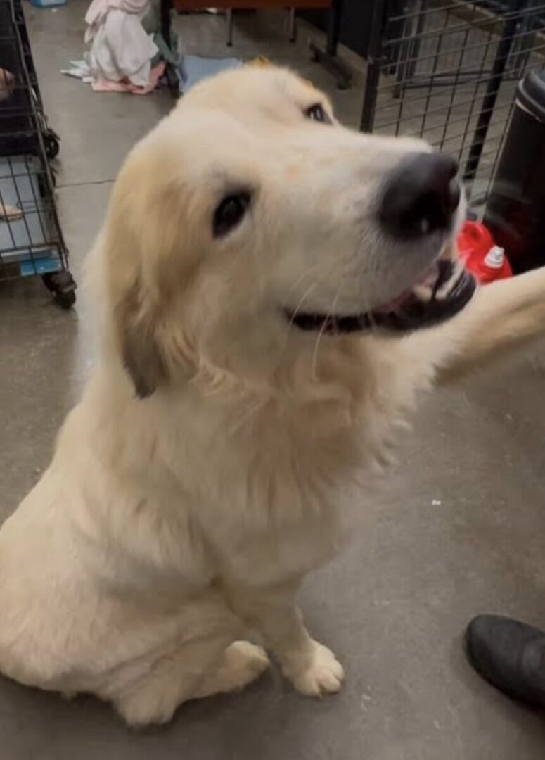 Griffon is so sweet. He loves attention and "giving hugs". He's great with other dogs and loves to run and play. A backyard would be very important for this guy so that he can play and exercise. A fence isn't required, but would be a definite asset for this sweet boy in order to let him out to play. You need to understand the Great Pyrenees breed. If you haven't researched it, you need to. They were bred to be guardians of livestock. In order to be good guard dogs, they were bred to be independent thinkers, which translates into being somewhat stubborn sometimes. It would be a good thing to take an obedience training class with Griffon in order for you to learn to be "pack leader". Great Pyrenees have a wonderful calm temperament that makes it a great family dog, good with kids. Because he is so big, it's tempting to let children roll all over a big dog. That isn't fair to the dog. Become aware of your large dog's cues and don't allow children to mistreat them. Griffon is very intelligent, so he would be easy to train. He's crate trained and house trained. Another thing you need to be aware of with Great Pyrenees dogs is their beautiful thick coat that requires routine brushing a couple of times a week to keep it from becoming matted. ~Adoption donation $400 . All vetting is up to date. Microchipped and neutered. Also on flea/tick and heartworm preventative. Visit www.ruffloverescue.com/adoption and fill out an application to make this pup a member of your family