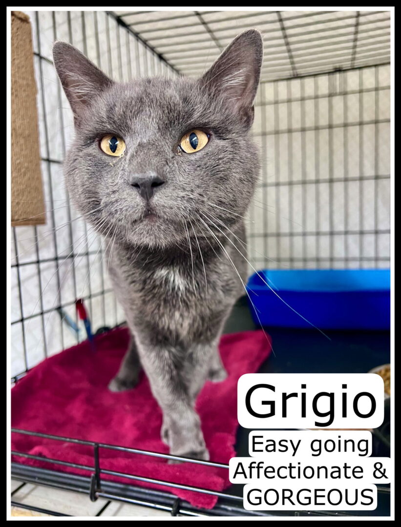 Meet Grigio! Grigio is a gorgeous, young, adult male, about 2-3 years old and weighing about 12 pounds. With his plush blue/gray coat and striking golden eyes, a Google image search suggests he may be a Russian Blue mix—though without DNA testing, we can only admire how much he looks the part! Grigio is an easygoing, affectionate boy who truly enjoys being close to his human. He has a gentle, calm nature and appears to be cat-friendly. While we don’t know if he’s ever lived with dogs, his relaxed personality suggests he could do well with proper introductions. His sweet demeanor also indicates he should be a great fit for a home with respectful children. If you’re looking for a handsome, loving companion who enjoys both affection and quiet togetherness, Grigio may be your perfect match. Please check out his video: https://www.youtube.com/shorts/PQSP0iEjrlQ . Please submit our no-obligation Adoption Application for a meet and greet or to adopt: https://forgottencats.org/adoption-application/. Not ready to adopt? Please consider fostering: https://forgottencats.org/foster-a-cat/. Thank you! (Foster: Willow Grove)