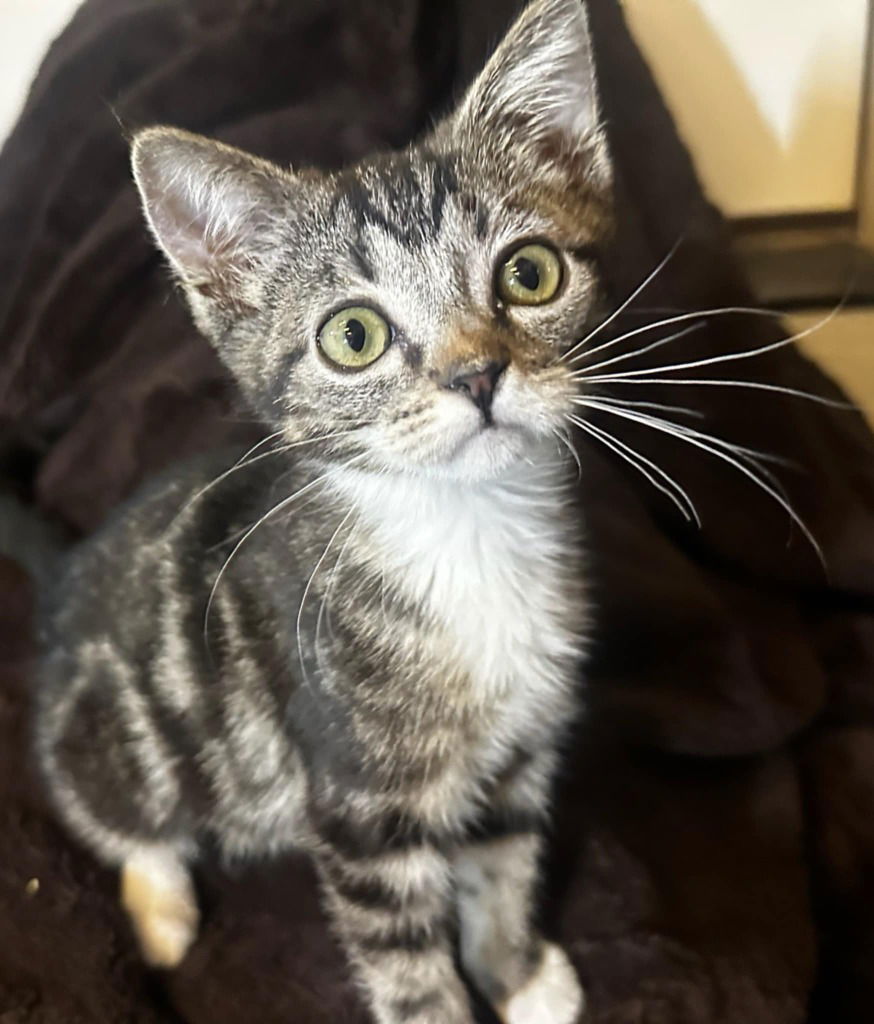 Gum drop is as sweet as her name! And just look at her beautiful mackerel tabby markings. This sweetheart loves playing with feather toys and foil balls. She loves people and will do well with older children, the little ones are a bit overwhelming. She is good with all cats and would love to have a feline sibling or two in her new home. She is also good with calm dogs. If you are interested in adopting a CAWS pet, please fill out an online application at https://caws.org/adoption-application