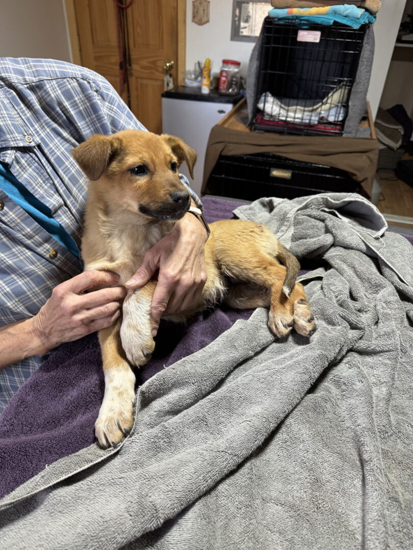 Oh my, the progress Gus has made this past week! He is now going out on his own, mostly following our other dogs, and playing and doing his business. He still does well in his X-pen but is now mingling with the other dogs in the living area and even mingling more with the people! He does get carsick, but that is not unusual in young dogs. He LOVES to play with toys and other dogs and is not afraid of cold–has a nice thick coat. We love this boy, but want him to find his own home before he gets too settled as we are too old to take in another pup! Baby Gus showed up at a home in northern New Mexico with some old bite wounds and a puncture wound on his abdomen. We took him in and got him to vet on same day. He had surgery to repair the puncture and was neutered at the same time. Doing well physically but we are working to help him overcome fearfulness. Sweet boy who will do well with gentle people and animals but may need some adjustment at first.