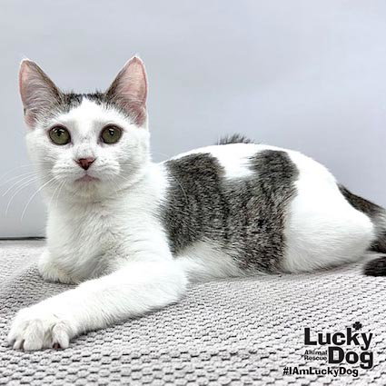 Please contact Anna Mikkelsen (anna.mikkelsen@luckydoganimalrescue.org) for more information about this pet.Pretty kitten needs a forever home!HADLEY NEEDS A FOREVER HOME! Name: Hadley Best Guess for Breed: Domestic Short Hair Age: 5.5 months as of 4/25/26 Estimated DOB: 11/6/25SEX: Female Approximate Weight: 4.2 lbs as of 4/6/26 Coloring: White and Brown Type of Hair: Short Gets Along With: With proper integration, Hadley will likely get along with other cats, dogs and kids with an acclimation period. We’re happy to help with tips and tricks! Currently Living at: Shelter — coming to the DC area soon! I am Looking For: My loving forever family! Hi! I’m Hadley, and I am a sweetheart! I won’t ask for much- just some love, cuddles and lots of toys so I can run and play and live my best life. What the Shelter Says About Me: Hadley is a pretty white and tabby girl who often sits and watches the world go by. She just wants everyone to know she is a bit more reserved than her sister -who she shares her space with. Hadley is not a shy girl with her sibling and loves a rough and tumble go with her, but she can be a tad shy with people. (She has lived with at least 5 other cats before so big kitty families are her norm.) It is just people – until she gets to know you on her terms. Once she is comfortable, she will accept all the affection she can receive. She is not the biggest fan of being snuggled but absolutely loves head and neck rubs. She’s a non aggressive baby and as sweet a pie once she has developed her trust . Hadley does love and needs a calmer and more subdued environment until she perceives no danger. Perhaps all that will change once she has a space of her own – and learns to really love! What My Foster Says About Me: Coming soon! TO ADOPT: The adoption fee for adult cats is $200 ($350 for two cats adopted together). The adoption fee for a kitten (under 7 months old) is $220 ($380 for two kittens adopted together).If you are interested in adopting, please complete the Adoption Questionnaire online at bit.ly/adoptaluckycat. Lucky Dog Animal Rescue does our best to provide accurate information about the cats we have for adoption. That said, we cannot make any guarantees about age, breed or temperament. Thank you for contacting Lucky Dog Animal Rescue and helping to save a life! Please visit us online at www.luckydoganimalrescue.org . BE A FOSTER!!! Fosters make it possible for Lucky Dog Animal Rescue to save and care for homeless and abandoned dogs! To learn about fostering, please contact fostering@luckydoganimalrescue.org BE A SPONSOR!!!! Sponsors help Lucky Dog support the many dogs we save. To learn more about sponsorship, please contact info@luckydoganimalrescue.org !