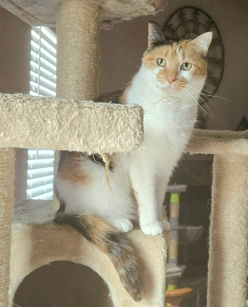 Purr-lo there, I’m Harmony—the feline symphony of curiosity and cuddles! My days are a perfect mix of playful overtures (aka chasing toys with gusto) and soothing interludes (sunbeam lounging at its finest). I’m an expert snuggle accompanist, always in tune with your every move—whether you’re hard at work or kicking back. Need a bit of motivation? I’ll be right there, supervising in my own charming way.. Winding down? Cue the gentle head scratch requests. Basically, I’m the ultimate duet partner—a melody of mischief and love, wrapped up in soft fur. Ready for some paws-itively perfect companionship? Because I’m ready to strike up a forever friendship! Harmony =^..^= , DSH Calico , Female, DOB 5/6/2023 Adoption Application – Cat Around Town Project