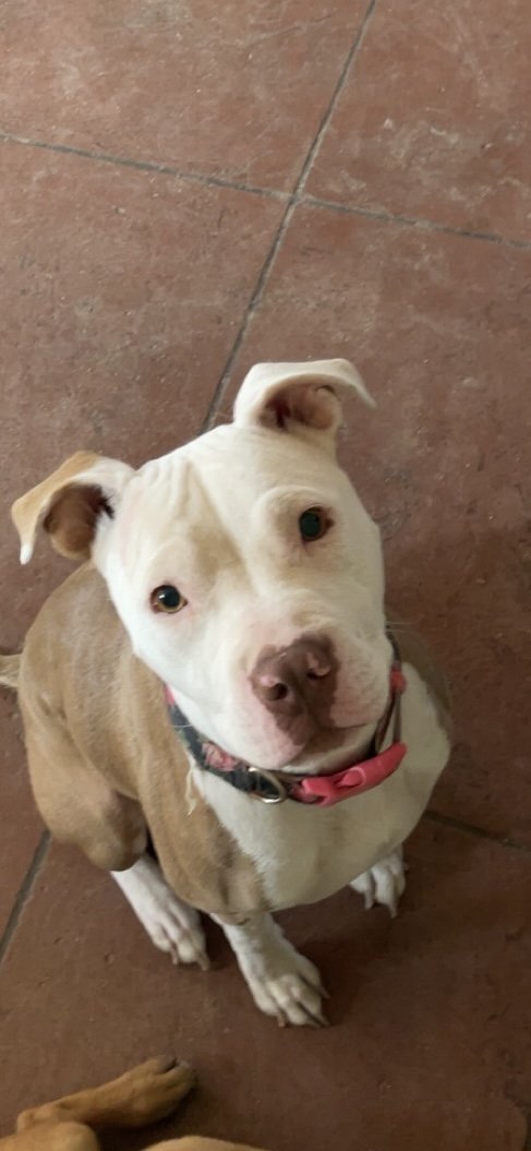 Hazel: 4-year-old pittie mix around 40 pounds. Very sweet girl, she knows how to sit and shake. She seems good with other dogs. Good in her kennel (takes about 10 minutes to settle down.) She is an owner surrendered to EAPL. Put in an app today at eapl.com Her adoption fee is $375