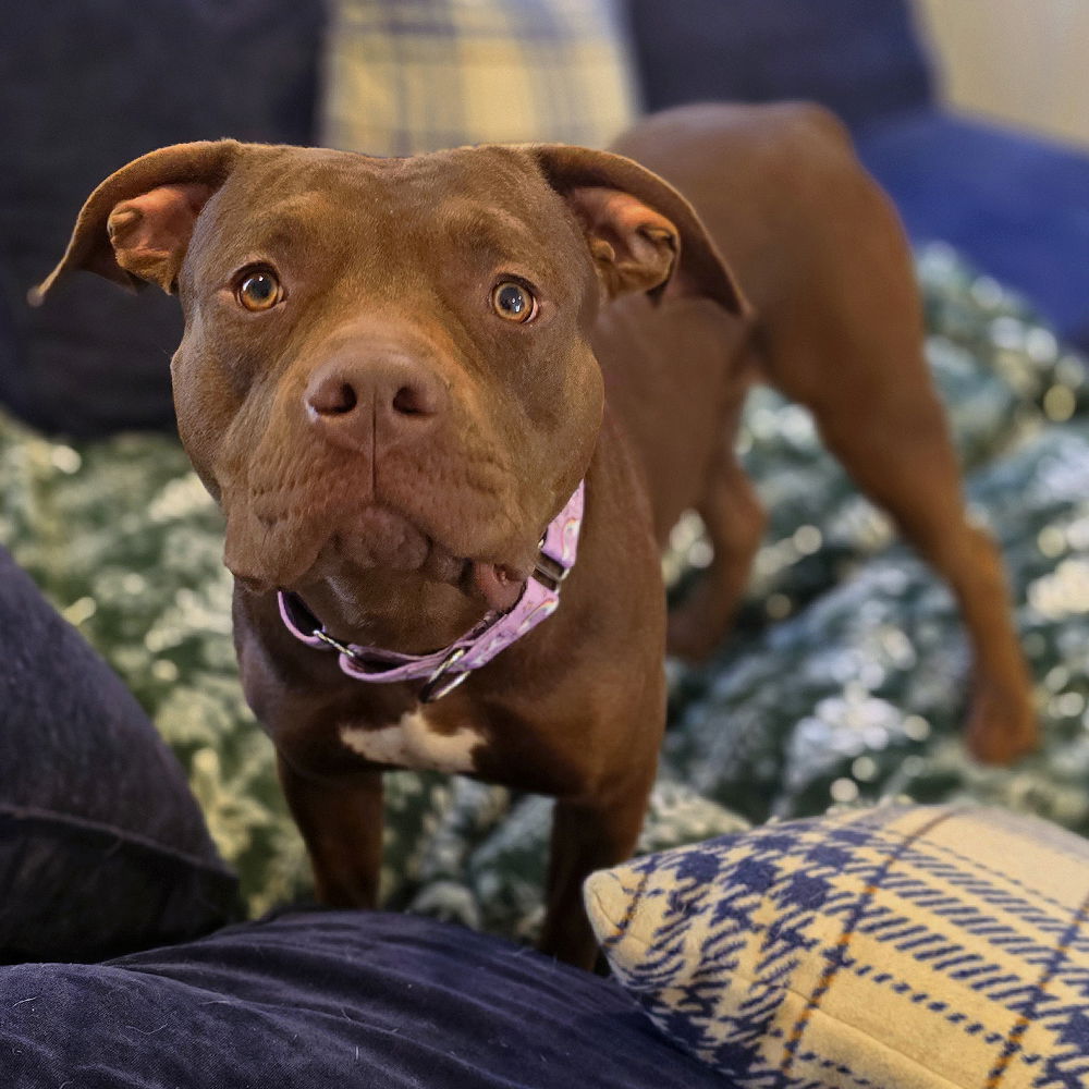 Meet Hazel! This 2-year old big-boned beauty came to us from local animal control after being found as a stray and wowza, is she a great dog! Hazel is definitely a full-figured stunner at 76 glorious pounds (of pure love!), but her calm demeanor immediately makes this cuddle queen seem more pint-sized. Hazel is shy at first but warms up quickly and loves to snuggle and be loved on. This acorn beauty enjoys walks and romping around in the backyard but mostly wants to be with her people. She enjoys chewing antlers and benebones, likes to instigate play with other dogs, and has perfected the art of napping. She has impeccable manners, never jumps on people, has never had an accident, and sometimes needs a handwritten calligraphy invitation to come onto the furniture just to make sure she is realllllly invited. Oh, and she is excellent in the car, patiently sitting to look out the window or lying down for some Zzzzz’s. While out and about, Hazelette calmly and appropriately greets everyone she meets (canine and human alike) and will give a quick sniff to dogs she has met in the past as a quick “hello”. Hazel is a gentle giant and is the perfect shade of hazelnut coffee with a splash of cream. She has a super unique toasted chestnut coat (and monochromatic eyes to match) and is quite the stunner with a perfectly soft and squishable face. If we had to describe her in only one word? LOVEABLE! Due to her size and lack of history, older or no kids would be best for this sweet and nutty plus-sized princess. Big is beautiful! Hazel’s top 3 priorities: 1. A family with a quiet home (bonus for a great speaker system playing relaxing music). 2. A family who is home often since she thrives with her people. She likes to move around the house checking out what people are doing. 3. A family who is looking for a human-size snuggler in bed and on the couch for a movie night. She is a great sleeper and just curls up on a spot in the bed and sleeps through the night.
