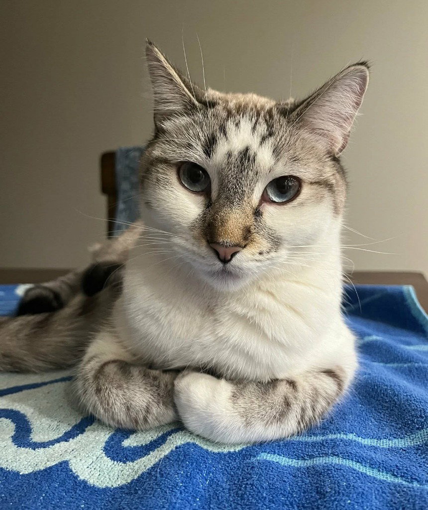 Hi, I am Hina I have the most beautiful blue eyes, gorgeous markings and a stripedtail with a black tip (adorable). I am a Siamese link point. I will be twoyears old in July 2026. I have a very sweet personality. I will need to getto know you and my surroundings. It will need to take patience andlove. Once I do I love to cuddle and be petted. I love to lay on softblankets or a towel. I really enjoy watching birds through the window. Iam an inside cat. I am very bonded to my sibling Socrates. We will needto be together. We bring so much joy, love and comfort to each other. If you are interested in adopting a CAWS pet, please fill out an online application at https://caws.org/adoption-application