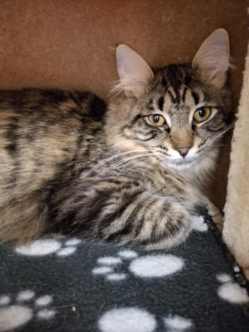 Hobbes – Male DOB 2/27/2024 Domestic Long Hair – Brown Tabby Hobbes has been through a lot in his short life and it shows as he is still a bit on the scared side. Volunteers have ben spending some extra time with him to help him be more confident and less afraid of people. He is still learning that people can be kind. He is in our quiet room with other nice, shy kitties who also help him see it's ok to come out from his favorite cubby spot. Hobbes is dreaming of a quiet home with cozy spots to nap in and big windows to watch the world go by. Hobbes will need to go home either with another kitty from the rescue to help him settle in, or home to another gentle, calm kitty. No dogs or children is best for him. Having lots of windows and sunlight for him to relax near would be a big treat for him. Hobbes will need a home with patient people who are willing to give him the attention he needs, and to let him settle in at his own pace. When he is in his cubby and you put your hand in quickly to pet him, he may give a little hiss at first, but if you’re patient, he’ll lean into those chin and neck rubs and reward you with the sweetest purrs. Please apply via our easy online application at https://furrr.org/cat-adoption-process/All kitten(s) and cat(s) at FuRRR Feline Rescue are spayed/neutered, up to date on vaccinations for their age, combo tested for FIV/FeLV, microchipped and have a Health Certificate from a licensed NH veterinarian. Our application is available to be completed online at https://furrr.org/cat-adoption-process/ Applying DOES NOT guarantee approval. We hold meet and greets with approved applications only. (Kittens are available for adoption in pairs only unless they are going home to another kitten or young cat under 3) Our policy is strictly NO DECLAWING and INDOOR ONLY. Adoption fees: Kitten to 1 yr – $300 Kitten pairs $550 Adult cat 1+ yr to 8 yr – $200 Adult pairs $350 Cat 8+ – $75
