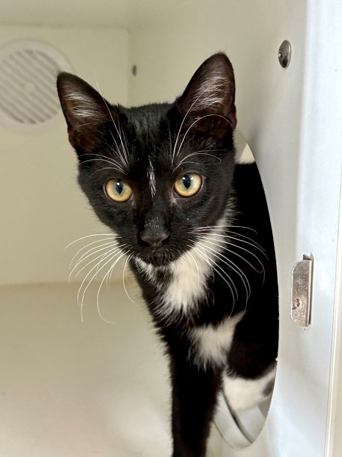 This adorable black and white kitty is Hollar! He is a loving and playful -month-old fellow looking for a family. Hollar loves attention, play time, snuggles and treats! He will fill his new home with lots of warmth and laughter.