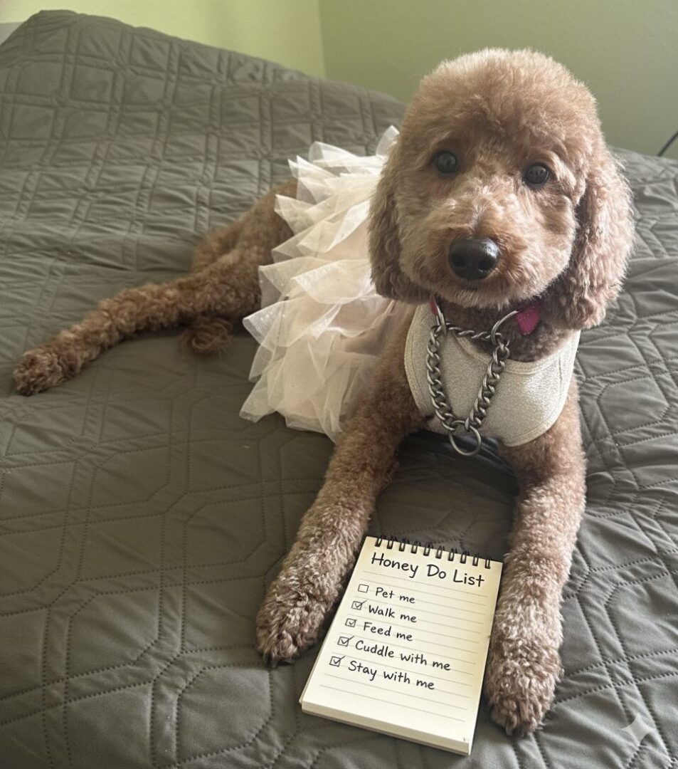 See Honey Doo’s HomepageGo to our official websiteYou can fill out an adoption application online on our official website. Meet Honey Doo Honey Doo is a 3-year-old Goldendoodle with a soft, curly golden coat and expressive black eyes. Weighing approximately 21 pounds, she is the perfect size for cuddling on the couch or accompanying her family on outdoor adventures. Her affectionate, calm, and loyal nature makes her an ideal companion for people of all ages. Personality and Temperament Honey Doo embodies the classic Goldendoodle personality—she is social, gentle, and loving. These traits make the breed excellent for families with children and other pets. Honey Doo greets her foster family and guests with exuberant enthusiasm, wagging her very long tail to show her happiness, even when meeting someone for the first time. She thrives on companionship and is happiest when she is with her human family members. If there is a dog bed in the same room as her person, Honey Doo will quickly claim it. Whether napping during her foster mom’s online meetings or cuddling up to her foster human sister in bed, Honey Doo proves herself to be a devoted and comforting presence. Her social spirit was evident during a recent Friendsgiving at her foster home, where she charmed a group of 10 teenage girls, making sure to greet and get to know each one. And Honey Doo likes going out to dog-friendly restaurants – she just sits calmly while her foster parents eat their meal content to be with them wherever they go. She even likes to participate in her foster mom’s exercise routines, staying as close as possible and offering her own brand of “assistance.” Though she sometimes appears puzzled by treadmill or stationary bike workouts where the foster mother’s feet move but her body does not. Training and Care Honey Doo is a quick learner who knows basic commands such as "sit," "stay," and "come." She is eager to please, and in return, she gets to enjoy walks and lap time with her humans. She will roll over for belly rubs and, when petted in her favorite spot, will smile and raise her leg in delight. Her Goldendoodle heritage means she is highly trainable and responsive to gentle guidance; however, regular grooming is essential due to her poodle lineage to prevent hair matting. Known for forming strong bonds with their owners, Goldendoodles are sensitive dogs. Honey Doo responds best to soft voices and gentle discipline, as noted by her foster family. She had a few potty accidents in the foster home but is learning to communicate better about when she needs to go outside. The adopter will need to continue to work with her pointing out where to go potties. Her deep attachment to people means she experiences separation anxiety when left alone—she will bark if crated or pace if left in the living room. Her foster family is actively working to help her feel more secure, and her future adopter will need to continue providing reassurance and support. 4 Lucky Dogs recommends Honey Doo live in a single-family house because her barking can get somewhat loud which will happen at the beginning of being in her new home until she is completely comfortable. Her Ideal Home Honey Doo would flourish with a family where she receives plenty of attention and companionship. With young children she sometimes gets jealous when parents divide their time between her and the child but Honey Doo loves older children since she can get petted or play with them. Also 4 Lucky Dogs found out that Honey Doo likes dogs and cats but does not like farm animals especially chickens. With an average lifespan of 15 years for her breed, her adopter should be prepared for a long-term commitment, ensuring Honey Doo remains in a stable, loving environment for the rest of her life—approximately 12 more years. Adoption Details Honey Doo’s adoption fee is $620. She comes up to date on all necessary vaccines and rabies shots, is heartworm tested as negative, microchipped, and spayed. She is currently being fostered in the Plant City/Tampa, Florida area.