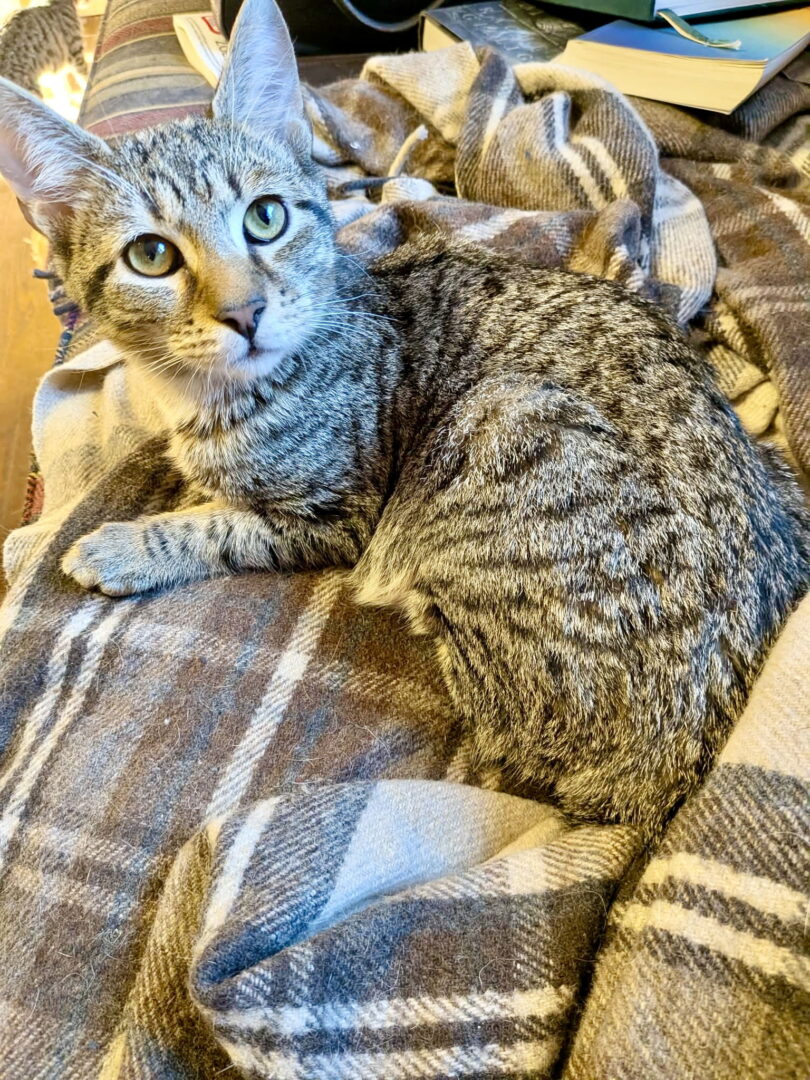 Greetings, humans! I'm Hook and Loop, but you can call me Hook, Loop, or Your Royal Floofiness. I'm a whirlwind of playful energy, a toy-destroying machine disguised as a cuddly cat! I believe in a good workout – mainly involving chasing lasers and pouncing on anything that moves (including your unsuspecting ankles, sorry in advance!). Now, about that whole “cuddly” thing… I'm a bit of a tease. I will politely request to be picked up, gazing at you with my irresistible kitten eyes. BUT, and this is a BIG but, my attention span is shorter than a goldfish's memory. I like to be the boss of how long I'm being held. I love a quick hug and then I'm outta there to wreak playful havoc. Think of me as the cat version of "hit it and quit it" – the cuddles, that is. I'm a social butterfly, though! Dogs? Cats? Bring 'em on! I'm down for a rumble (a friendly one, of course) or a nap pile. Speaking of naps, I occasionally grace a lap with my presence. Consider yourself blessed if I choose yours – it's a rare and treasured experience. So, if you're looking for a playful, independent, yet still somewhat affectionate kitty who's good with everyone, I promise to keep you entertained, on your toes, and just maybe, sometimes, even let you cuddle me… for a minute. No promises! Hook and Loop =^..^=, DSH Brown Tabby, Male, DOB 4/17/2025 https://cataroundtownproject.org/adoption-application/