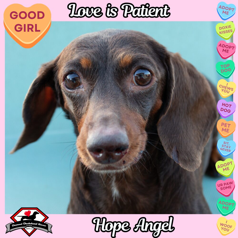 See Hope Angel’s HomepageGo to our official websiteWelcome to the Wonderful World of Rescue Dachshunds. Look around and read their bios. Find a few whose personality seems to fit well. Consider one of our Well Seasoned Seniors who are truly wonderful and have so much to offer. Need help finding the best fit? We'll help with that too. Please fill out an application and let’s get you all matched up with a loving new “furever’ companion and friend. You’ll find the application on the “Available Dogs” page. NOTE: Adoptions to Central/South Texas residents only Please see FAQs for current adoption fees. DDRTX only adopts in Central/South Texas. Email: ddrtxinfo@gmail.com Primary Website: www.DDRTX.org Hope Angel is a 6 year old chocolate female dachshund and she weighs 14 pounds. She lost her home due to the owners health. Hope is a loving dog that just needs a little patience at the beginning because she is shy to new people and things. Once she is comfortable, she is super sweet and is perfect for anyone looking for a lap dog that loves attention. She loves to eat and cuddle on the couch. Hope needs an adopter that is home more often and another dog for companionship when you aren't home. She doesn't do well being left all day and alone. She is good about using the puppy pad and if she had it her way she would never go outside. Hope would prefer a quieter home where she can be lazy and cuddle often. The foster has just learned during the holiday break, that Hope is a door darter. She will need someone that understands that and will be very cautious to keep her safe. Love dachshunds and not ready to adopt or circumstances won't permit having a dog? How about being a sponsor or making a donation. Every one of our dachshunds receives excellent medical care along with day to day food, love and housing. Being non-profit, we rely on generous individuals like yourselves to help save these fur babies. You can do this specifically for one dog with the sponsor button on their webpage or a general donation on our “How To Help” page. Easy and quick through Pay Pal or your debit/credit card. You generosity is sincerely appreciated by all and is tax deductable. Need other ideas? You'll find tons of them on the How to Help tab. All contributions are tax deductable. Diamond Dachshund Rescue of Texas is a non-profit 501(c)(3) volunteer organization with focus on rescue and adoption of pure breed Dachshunds. All dogs are fully vetted and housed on private property. Meetings are scheduled upon adoption approval. Thank you for your continued support to the rescue and shelter communities! Opt to Adopt!