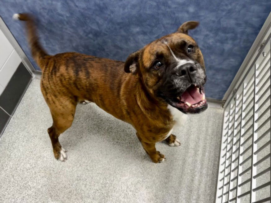 Hi, I am Hoss. I am a super sweet, gentle and loving pup looking for a home. I like to cuddle, chew on bones and play with my best friend. I can be jumpy when excited and pushy when excited so I would like to meet any other dogs in the home before adoption. I did come to the shelter with my best friend Grace and we would love to go home together. We would love to meet you and become a part of your family.