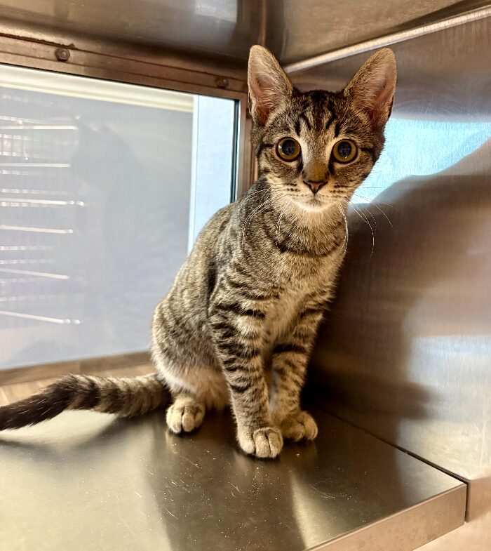 Hello Howard! This little cutie is 5 1/2 months old and came to us with a sibling named Leonard. Howard is playful, friendly and loves to observe all that is going on around him. Howard is hoping to find his new home soon!