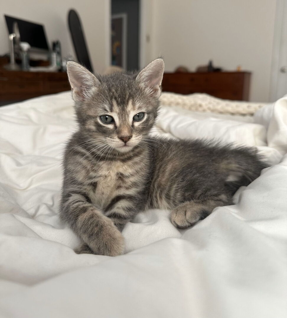 All of our cats are current on vaccines, combo tested (FIV/FELV) , spayed/neutered, microchipped, given rabies vaccine as age appropriate, flea treatment and dewormer as needed Hi, my name is Hugs, DOB 4/11/25, and I am a stunning girl with beautiful grey and cream stripes! I'm the perfect mix of spunky and sweet. When I'm not zooming around at max speed (which is my favorite past time), all I want is to snuggle in my foster mom's lap for a snooze. I love to explore and play with my litter mates and would do well with another kitty companion to keep me entertained. T-CPU5-25**Want to adopt? Get started here: https://catmatchers.org/adoptions/adoption_application_page/ **Do you or someone you know want to help in saving cats' lives? Become a Foster Parent! We are ALWAYS looking for more people to become qualified Foster Parents. For more information on the Foster Program or helping in other ways, click here: https://catmatchers.org/volunteer/ You CAN make a difference!!!! **Not quite ready to adopt, but would like to donate to the care of this or other animals during their temporary stay with Cat Matchers? Visit this link: https://catmatchers.org/donate/ Follow us on Facebook, Instagram, Twitter: @CatMatchers