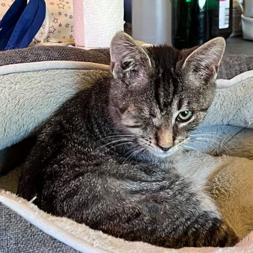 Hurricane is a male gray tabby, born on August 13, 2024. The three of them, (Helene, Stormy2, and Hurricane) came out of the woods with ulcers on their eyes. Hurricane’s was pretty much already gone and he had the eye removed. He looks like a serious boy but he cuddles like a sweetheart. Hurricane is quiet but sweet, shy but affectionate, loves to play, loves to watch the birds, is well-behaved and uses the litter box like a champ. Hurricane and his sisters were a rescue after Hurricane Helene. The adoption fee is $150. This covers the cost of spay/neuter, PVR, Rabies, flea, tick, ear mite and worm treatment. To adopt, you need to first fill out an application. Go to: https://rutherfordcountyhumanesociety.org/cat-adoption-application/ We are located in Western North Carolina. Optional transport is weekly. After your application is approved, we will contact you regarding cost and delivery if you so desire.