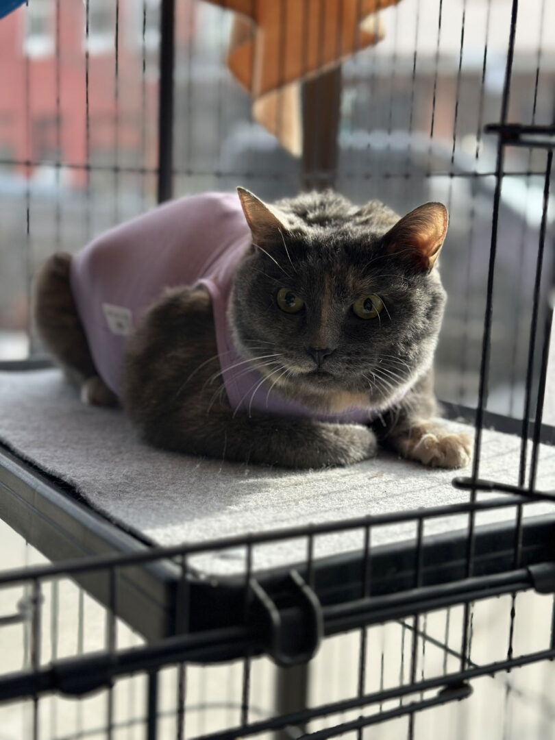 Meet Ida, a sweet and spunky 5-year-old cat with a heart full of love (and a bit of a mischievous streak). Ida is a real survivor—she recently had surgery to remove a pesky skin ulceration and is now fully healed, though she still has a bit of a habit of trying to lick her belly, much to her vet’s dismay. To help her out, Ida rocks a stylish onesie to keep her from causing any more trouble with her skin. Despite her skin condition, Ida’s spirit remains as cheerful as ever. She follows a special prescription diet to keep her feeling her best and, of course, she’s a big fan of cuddles and chin scratches. With her onesie on, she’s as comfy as can be and ready to enjoy every moment of her cozy life.