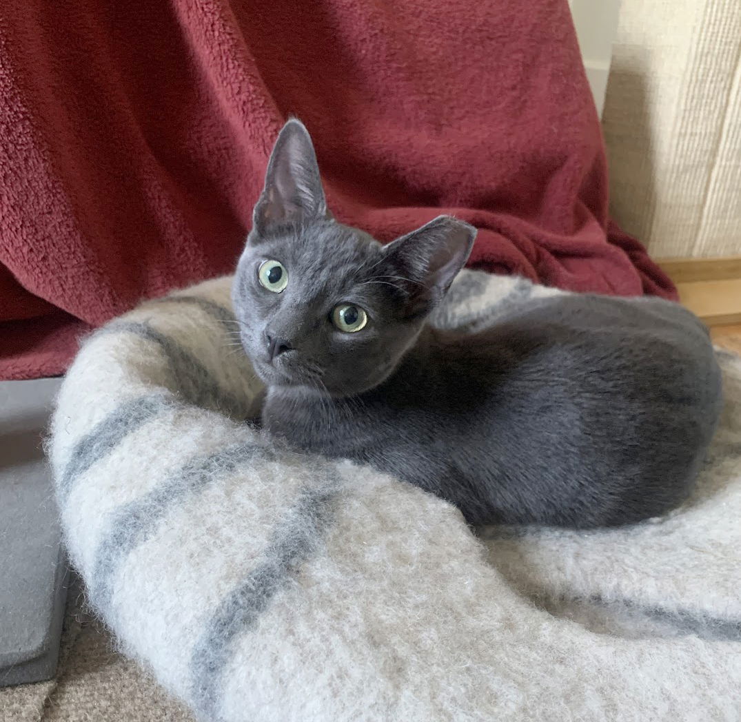 Iggy is a stunning, sleek, smoky gray kitty with fur as soft as velvet and a majestic white star on his chest. He and his brother, Yoshi were from a TNR project but quickly let us know they wanted the good life indoors so they sport the jaunty ear tip of a community cat but are experts in giving all the love and snuggles of a house cat in training. Iggy lives to play, he will play all day if you have the time and energy! He is an accomplished hunter and uses his amazing athleticism to leap in the air and catch his toy prey, dragging it off to his lair. Iggy is a little cautious at first around humans he doesn’t know yet, but once he knows he can trust you (because you have learned that Churu meat tubes, tons of play time and kitty treats are the way to his heart), he will show you how much he loves pets and scritches and will patiently wait for you to let the fun begin, staring right at you with his soul searching eyes until you get the message! Iggy loves to watch the birds at the bird feeder, sitting in sun patches and climbing the tall cat tower. He is a strong, athletic kitty and would do well with older, gentle children who can respect his boundaries, and a patient, cat savvy adopter who has the time and patience to build a trusting relationship with him. Iggy would love to be adopted with his brother Yoshi , to whom he is bonded, but would also do well with a playful older cat to show him the ropes in his new home. Iggy will need a kitten proofed “base camp” and some hiding spots at first until he feels confident enough to have the run of the house. Dogs are untested. Iggy’s estimated date of birth is mid-April, 2024. Kitty Bio #980EP-Ig. If you're interested in adopting this or another of our cats, please fill out our adoption questionnaire at https://icraeastbay.org/adopt/how-to/.