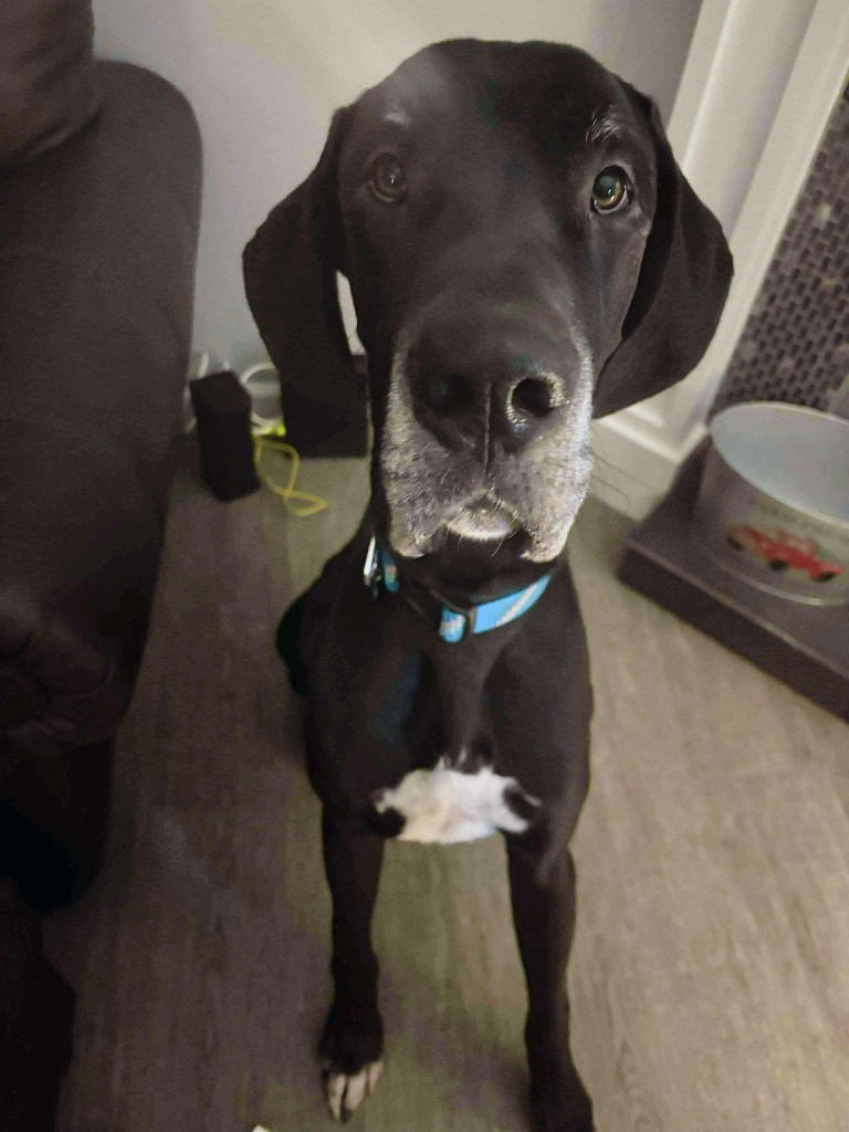 LOCATION: DOB: 09/18/2022Jager is a wonderful dog who was surrendered due to his owner’s move and divorce. He is great with dogs of all sizes and has done well with kids aged 7, 10, and 15. While he hasn’t met any cats, his friendly nature suggests he might do well with them too.Jager is housebroken and has excellent house manners. He is the better listener of the two brothers and is a bit more calm. He doesn’t get on the furniture and loves to drag his blanky around to cuddle up with. Jager has a unique way of mumbling to get you to play with him, which sounds like growling but is just his way of chatting with you. He really loves squeaky toys and will growl playfully to get you to join in the fun.Jager is looking for a loving home where he can continue to be the calm and affectionate companion he is. If you’re interested in giving Jager a forever home, please let us know!All of our Great Danes are altered, if medically possible, fully vetted, micro-chipped, and on heartworm prevention or treatment prior to being adopted. Thank you for considering adopting a rescue dog, you’re saving a life when you adopt.========================= To apply to adopt me, please fill out the application form! https://form.jotform.com/51994996709176 .For more information, please email us at rescueme@srgdrr.org. For an application to foster or adopt, please go to www.saverockythegreatdane.org and fill out an app. Thank you so much, we look forward to helping you.