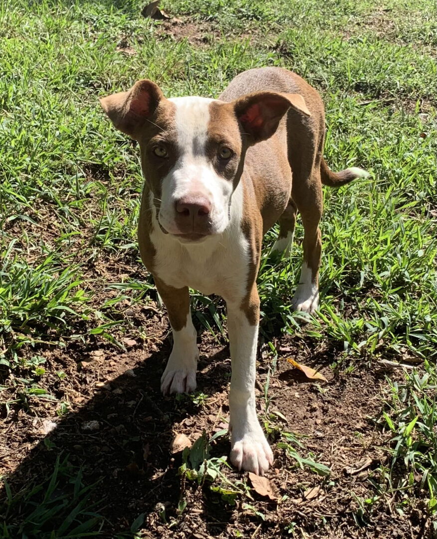 Baby Staffie mixJana’s person was put in hospice care so she came to us. She is very sweet and social and gets along great with all her foster mom’s other dogs. Jana is just a baby, guesstimated to be born sometime in March, so she is your clay to mold. Please send us your phone number if you would like to hear more about Jana!!