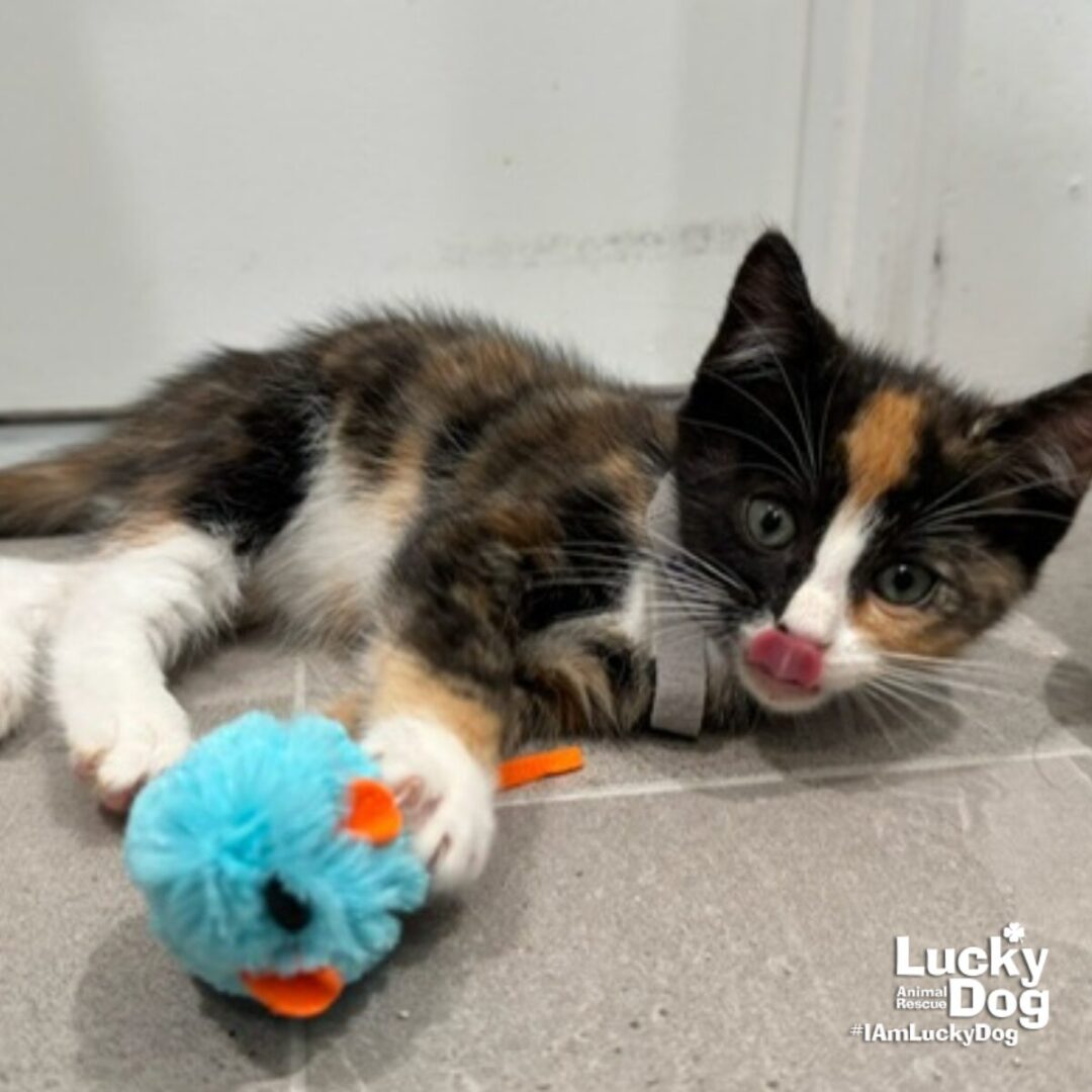 Please contact Mollie Gorney (mollieg@luckydoganimalrescue.org) for more information about this pet.Sweet Kitten ISO a Forever Home!JASMINE NEEDS A FOREVER HOME! Name: Jasmine Best Guess for Breed: Domestic Short Hair Age: 9 weeks as of 10/26/25 DOB: 8/21/25 SEX: Female Approximate Weight: 1 lbs 4 oz as of 10/8/25 Coloring: Calico Type of Hair: Short Gets Along With: Because of her young age, Jasmine will likely get along with other cats, dogs and kids with an acclimation period. We’re happy to help with tips and tricks! Litter: Jasmine, Jade, Jax, Jupiter Currently Living at: DC area foster home I am Looking For: My loving forever family! Hi! I’m Jasmine, and I am a cute little kitten! I won’t ask for much- just some love, cuddles and lots of toys so I can run and play and be my kitten self. What my Foster Says About Me: Jasmine is the most energetic. She LOVES to play both by herself and with her siblings. :) Kitten Vetting Requirements: Your kitten may not be fully vaccinated upon adoption. You will be responsible for providing whatever remaining vaccines are needed to complete the kitten vaccine series. Due to this kitten’s young age, she/he has not yet been spayed or neutered. As part of the adoption contract, it will be your responsibility, as the adopter, to ensure that this is done no later than 2/21/26. There are NO EXCEPTIONS and NO EXTENSIONS to this date. A non-refundable spay/neuter deposit will be collected if you would like Lucky Dog to pay for this animal to be spayed/neutered at one of our low-cost partner vets. TO ADOPT: The adoption fee for adult cats is $200 ($350 for two cats adopted together). The adoption fee for a kitten (under 7 months old) is $220 ($380 for two kittens adopted together).If you are interested in adopting, please complete the Adoption Questionnaire online at bit.ly/adoptaluckycat. Lucky Dog Animal Rescue does our best to provide accurate information about the cats we have for adoption. That said, we cannot make any guarantees about age, breed or temperament. Thank you for contacting Lucky Dog Animal Rescue and helping to save a life! Please visit us online at www.luckydoganimalrescue.org . BE A FOSTER!!! Fosters make it possible for Lucky Dog Animal Rescue to save and care for homeless and abandoned dogs! To learn about fostering, please contact fostering@luckydoganimalrescue.org BE A SPONSOR!!!! Sponsors help Lucky Dog support the many dogs we save. To learn more about sponsorship, please contact info@luckydoganimalrescue.org !