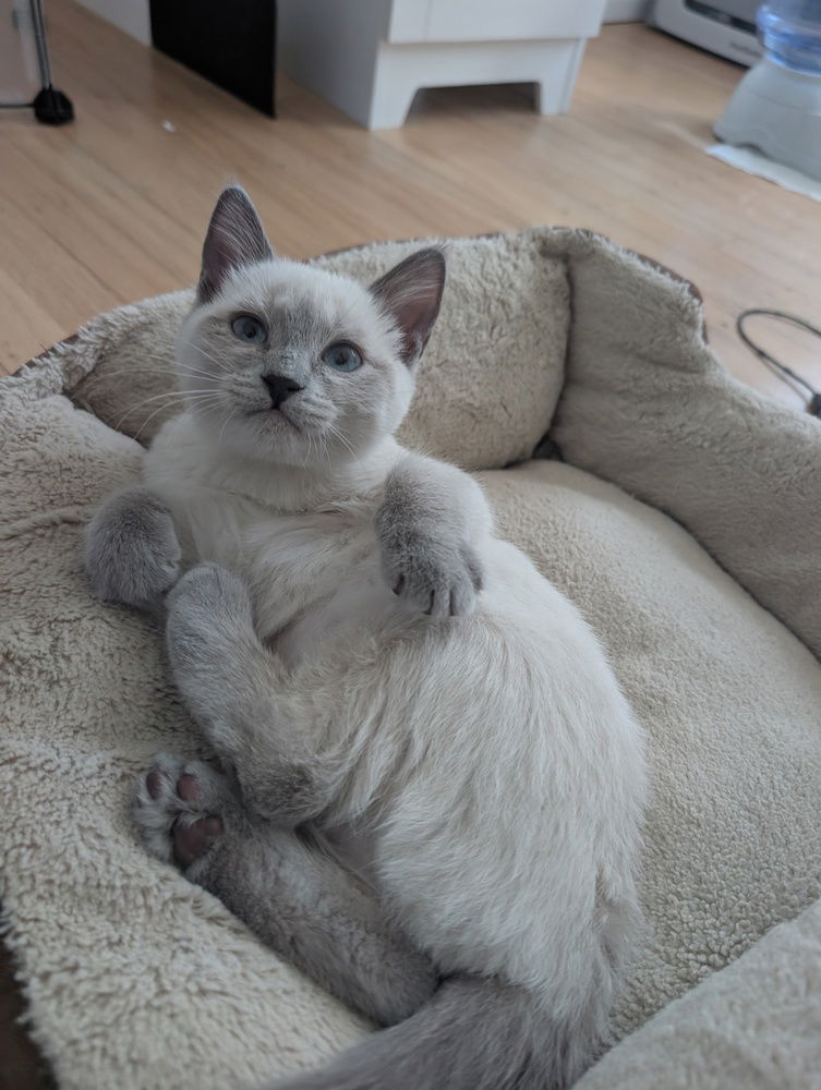 Jewel – A Shiny Little Fighter Jewel may not have gotten as sick as her sisters, but she fought her own battle right alongside them. Coming from the same fragile litter, she started showing symptoms early on — decreased appetite, low energy, and the kind of ups and downs that had us watching her closely day and night. She needed supportive care, medications, and careful monitoring to keep her stable while her siblings were fighting for their lives. Compared to Ube and Hannah, Jewel’s illness was milder, but it was still serious for a young kitten. Thanks to quick intervention and her own spark of resilience, she responded well to treatment and has made a beautiful recovery. Today, Jewel is healthy, playful, and living like the kitten she deserves to be. She wrestles, explores, eats well, and has that bright, curious energy that makes her name fit perfectly. Because she was part of the same vulnerable litter, we can’t say with absolute certainty what her long-term health will look like, but right now she is thriving with no lingering symptoms. Most kittens who bounce back the way she has go on to live completely normal lives — and we are hopeful the same will be true for her. Jewel is sweet, gentle, and steady — the kind of kitten who brings calm joy wherever she goes. She would be a wonderful addition to a loving home ready to give her the happy, healthy future she’s earned. Jewel is ready to shine in her forever home.