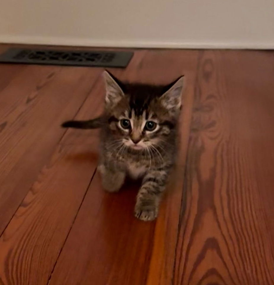 Jigsaw is a 10-week-old mostly black tabby kitten with cream stripes. She was rescued with her two siblings around 7-weeks. Jigsaw is sweet, cuddly, and slightly smaller than her siblings and tends to sit back and watch for a bit before jumping into action. Once she sees her siblings playing, she can’t help but leap into the fray before regrouping and then jumping in again. She is always the first kitten to start eating when meals are served, and lets her larger siblings know when she is eating and that they need to find their own bowls. Jigsaw loves to play but also loves to cuddle with her foster family. She enjoys batting toys around, playing with a feather or toy mouse, and batting at balls in a circular ball toy. Jigsaw used the litter box on day one and is very tidy. She is comfortable with children and adults alike and does not mind a loud/busy house. Jigsaw is currently not up to date on vaccines or spayed, but will be prior to adoption! She will be available for pick up mid-July! Interested in adopting? Of course you are! Submit an application here!