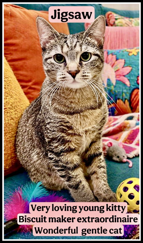 Meet Jigsaw *see video Jigsaw is a precious young tabby girl with a heart as big as her story. She was first spotted standing alone in an alleyway, but the moment she saw a kind colony feeder, she walked right up as if to say, “I’m ready to go home.” And just like that, her new chapter began. From the minute she stepped inside, Jigsaw settled in with ease—clearly grateful to be safe and loved. This sweet girl is a quiet little “biscuit maker,” with the loudest purr! She’s happiest when she’s cozy and content. She has a gentle, loving nature and absolutely adores human affection. Jigsaw isn’t shy about asking for attention either—she’ll charm you with soft headbutts and affectionate face rubs to make sure you know she’s ready for love. She’s also frequently playful If you’re looking for a devoted, affectionate companion who will happily remind you how much she cares, Jigsaw is your girl. Please submit our no-obligation Adoption Application for a meet and greet or to adopt: https://forgottencats.org/adoption-application/. Not ready to adopt? Please consider fostering: https://forgottencats.org/foster-a-cat/. Thank you!