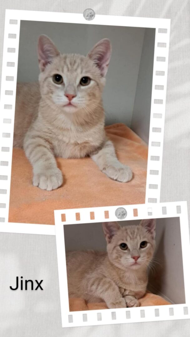 JINX – DSH, male, neutered, buff tabby, DOB Oct 8/24 Meet Jinx, a kitten with a heart full of love and a personality that will brighten up your day. His sweetness is contagious, his friendliness warms hearts, and his gentleness is a comfort. He thrives in the company of other cats, and he's yearning for a kitty companion in his new home to share his adventures.