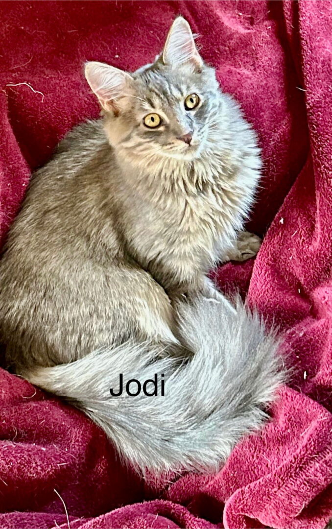 See Jodi’s HomepageGo to our official websiteMy brother Scout and I are so pretty together! Him with his silky, gray & white fur and me with my long silky striped fur! I have one other “brother” Arroz, (adopted into our litter) which I love just as much, and I really would like to be adopted with one of them because I’m a little on the shy side. I’m nervous until I get to know you! My brothers are very outgoing. I guess I got all the “shy” in the family! Anyway, I am ready for my forever home and I was hoping you would choose me! If you are patient, you will have a beautiful sweet kitty that you will adore! Love, Jodi