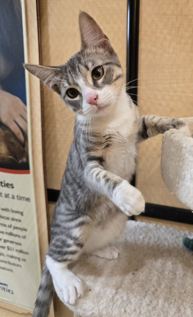 Joey’s the name, and I’ve got confidence, charm, and a playful streak to match. I’m an 8-month-old gray and white tabby who was found roaming the streets of Garland, but I’ve decided indoor life is much better. I’m confident, playful, and very lovable. I enjoy exploring, playing, and being part of whatever you’ve got going on, but I’m just as happy soaking up attention and spending time with my people. Life outside is behind me, and I’m more than ready for a home where I can feel safe, have fun, and be loved. If you’re looking for a friendly, easygoing companion who’s happy to be right where you are, I’m your guy. I am available for adoption at PetSmart Rockwall located at 931 E Interstate 30, Rockwall, TX 75087. For more information about me, please email cats@frastx.org.