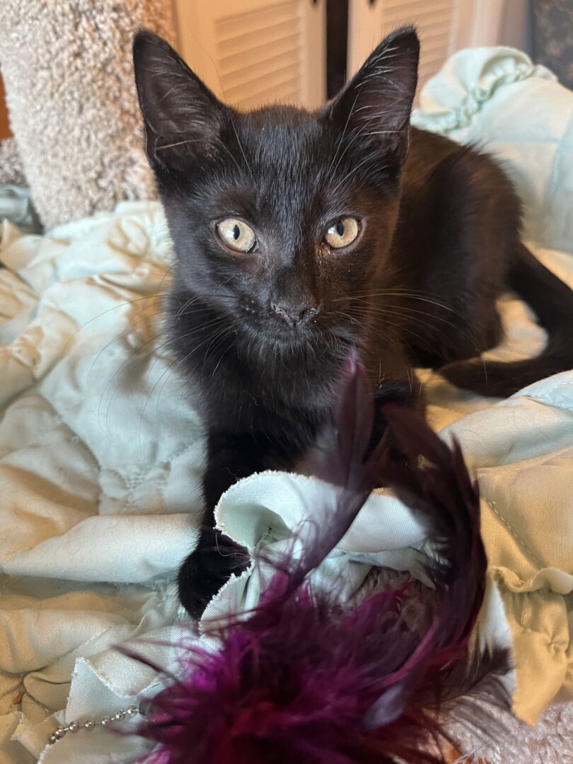 Johnny is an adorable kitten with silky black fur. Johnny was the first, second, and third to escape the enclosure at his foster home. The little adventurer was found curled up in the spin basket of the mop bucket. Johnny is very playful and loves leapfrogging over his siblings. He likes to visit the toy box so he can pick out his favorite toys. He loves balls, especially ping pong balls. Johnny is so easygoing and always ready to cuddle, snuggle, and “make biscuits”. He lays in your arms like a baby and just goes with the flow. If you’re looking for a precious, playful kitten who loves to snuggle, then Johnny is your boy! If you are looking for two kittens, Aria would love to be adopted with Johnny as she replies upon him. Please check out the sibs’ video: https://www.youtube.com/shorts/TP_zG36kdrA . Leilani (tux), Aria (gray) and Johnny (black) are playing with their foster family. Please submit our no-obligation application: https://forgottencats.org/adoption-application/ . Thank you! (Foster: Nancy P.)