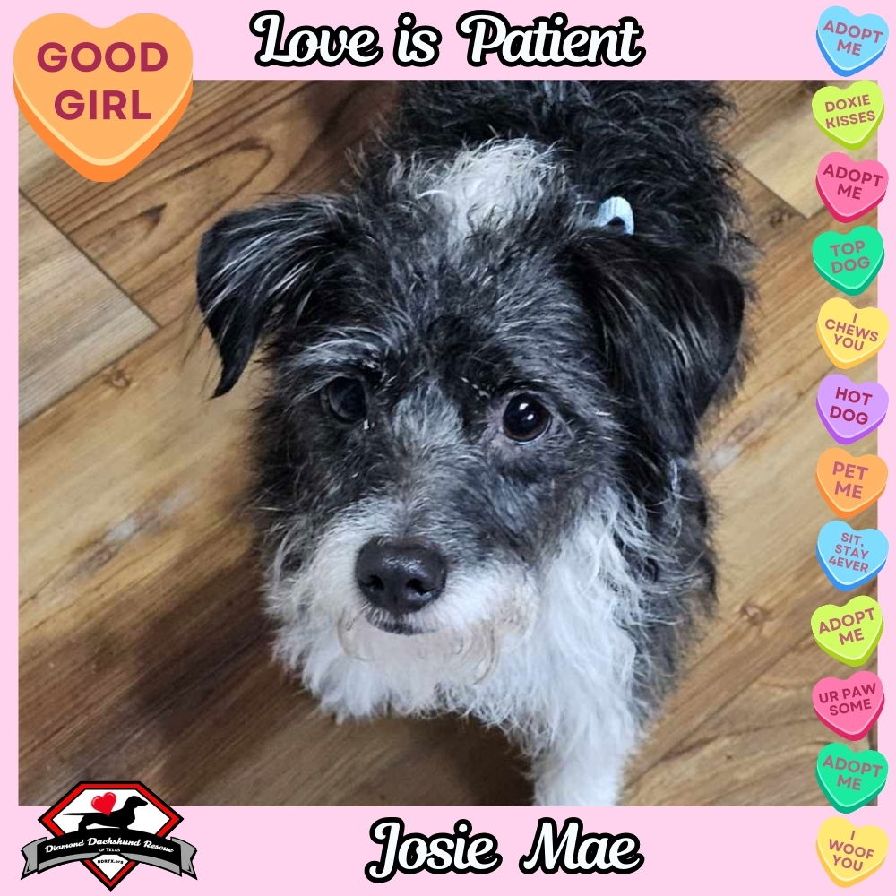 See Josie Mae’s HomepageGo to our official websiteWelcome to the Wonderful World of Rescue Dachshunds. Look around and read their bios. Find a few whose personality seems to fit well. Consider one of our Well Seasoned Seniors who are truly wonderful and have so much to offer. Need help finding the best fit? We'll help with that too. Please fill out an application and let’s get you all matched up with a loving new “furever’ companion and friend. You’ll find the application on the “Available Dogs” page. NOTE: Adoptions to Central/South Texas residents only Please see FAQs for current adoption fees. DDRTX only adopts in Central/South Texas. Email: ddrtxinfo@gmail.com Primary Website: www.DDRTX.org Hello all! My name is Josie Mae! Fortunately, I was rescued by Diamond Dachshund, though no one really knows my back story. They tell me I'm about 3 years old and I weigh about 11 pounds. I'm in good health except I have those nasty little heartworms. My foster mom thinks I'm super smart- I knew my new name within 2 days. Here's a few things about me that you'll love! I'm house trained, I come immediately when you call me, I'm obedient, I can sleep in the big bed or beside you on the floor, I'm playful with you or with other pups (but I'm having to take it easy right since I have HW). Overall, I'm just really good pup. I like being outdoors so a yard would be nice. I'm currently going through heartworm treatment but I'm available for adoption under a Heartworm Contract. I just need to be in a place where I can rest up till the treatment is over. If you think we would make a good match, let's plan to meet up! If you don't already have an approved application, get yours in today. With my scruffy good looks, there's probably going to be a lot of people wanting to meet me! Love dachshunds and not ready to adopt or circumstances won't permit having a dog? How about being a sponsor or making a donation. Every one of our dachshunds receives excellent medical care along with day to day food, love and housing. Being non-profit, we rely on generous individuals like yourselves to help save these fur babies. You can do this specifically for one dog with the sponsor button on their webpage or a general donation on our “How To Help” page. Easy and quick through Pay Pal or your debit/credit card. You generosity is sincerely appreciated by all and is tax deductable. Need other ideas? You'll find tons of them on the How to Help tab. All contributions are tax deductable. Diamond Dachshund Rescue of Texas is a non-profit 501(c)(3) volunteer organization with focus on rescue and adoption of pure breed Dachshunds. All dogs are fully vetted and housed on private property. Meetings are scheduled upon adoption approval. Thank you for your continued support to the rescue and shelter communities! Opt to Adopt!