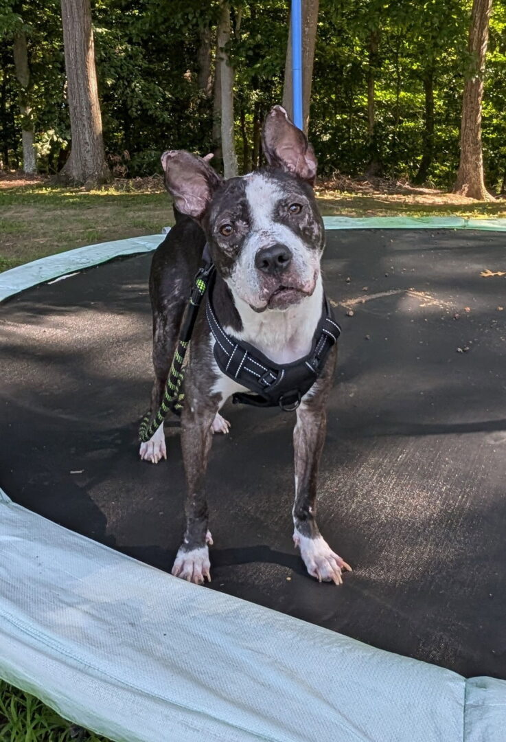 HAS HAD PROFESSIONAL TRAINING Jumpy is a sweet, playful young dog who has bounced back from a tough start with an affectionate, happy-go-lucky personality. He loves all people and other dogs of all sizes, enjoys cuddles and lap time, and adapted well to apartment living with minimal fuss over city noise. While he gets bursts of zoomies, he balances that with long naps and is content entertaining himself with toys. Jumpy is crate-trained, housebroken, non-destructive, and improving on leash manners, with a preference for daily walks and outside time but flexibility when schedules are tight. Jumpy is a loyal, goofy, and easy-going pup who would make a wonderful companion, especially in a home with another dog to play with. Personality and Health: Jumpy is a sweetheart to his core, who despite his rough start to life has a lot of trust and love for the people and dogs around him. He seems to be the happiest pressed to my side, or playing with other dogs. His favorite evening activity is laying belly-up in your lap, snoring like a trucker. His name definitely comes from his enthusiasm when greeting people, which while adorable, is a train-able thing that we are working on with him and he is showing progress with. Ironically, he has not shown any interest in actually jumping on or over anything – even a counter with steak on it. Jumpy does a lot of adorable head tilts, especially when you call him a goofy goober, which he has a weirdly strong reaction to. He thinks he is a lapdog, and mainly just wants to sit in your lap and be where you are. Jumpy lived in a suburban home with a fenced yard and 2 doggie friends of similar size. He previously spent a few months in a 1 bedroom apartment in downtown DC with a WFH workaholic, and ignored pretty much all city noise, neighbor footsteps, fireworks, etc., though he loves to people watch out the window (very nosy). He is at his best behavior when he gets a 20 minute morning walk (will sleep all day), but has no issues with a quick morning pee break if you're in a rush (more common). He is a young happy boy who deserves a good amount of outside time, but won't go nuts if he has to be cooped up for a day or two due to weather or other commitments (like meetings until 7pm). He has been left alone in the crate for a full workday with no issues, but we know he would happily spend that whole time on the couch if his forever home allows it. He is a healthy 50lbs and we got his DNA tested, showing he is clear for all 260+ genetic health issues that Wisdom Panel screens for. Energy Level and Activity: While he has young dog zoomies at playtime, he has just as much of an affinity for naptime on the couch and lazy cuddles. When I am WFH, cooking, or doing anything that is not to do with him, he likes to be able to see me, but won't follow me around – typically will just lay on the armchair or bed and stare at me. If he gets the zoomies while I am busy, he has shown that he's able to play alone and self-soothe with a bone or a stuffy. He looooves to squeak his toys during meetings when I have to talk, and my coworkers find him very funny – but if it's a serious one, he does fine in the crate or other room. His favorite type of toy is a new one, and he will try them all out. Of course, he has an XL lambchop he cuddles with every day. He is good with sharing with other dogs and does not guard. He needs a home to himself. He likes playing with dogs but not sharing his home. When let loose in a fenced yard, Jumpy sniffs and explores and has not done any digging or chasing of any squirrels etc. Other Dogs and Kids: Jumpy excels with dogs and would love to play with other playful pups. We have found he is best matched with a similarly sized dog He is a vocal player and likes to wrestle. He had a sitter once with a cat, where this approach worked fine and the cat just avoided him. We haven't tested him 1:1 with a cat, but I would bet good money he would try to play with them too, but cats would likely be able to evade him easily if they weren't interested . When he sees other pets on walks he definitely takes note but won't drag you over to them, sometimes he just gets low and waits for them to approach. He has not shown any signs of leash reactivity and has done well at the park, even if being ganged up on. Jumpy is oblivious in a very sweet way – he does not piece together when other dogs don't want to play or don't like him, he thinks all barking is play barking. He really thinks the world is full of butterflies and unicorns. We are working on socializing him with other dogs in new situations and better understanding their "no" signals, and he is getting better at learning when playtime is over or the other dog isn't interested. All said – if you have a playful dog at home, Jumpy is your best solution to tiring them out. In the home: He has shown to be housebroken, no marking in the home, including periods of more than 4 hours, and 10+ overnight. He usually does not bark or whine while we are gone and he's in his crate, and when he does he stops and settles down after the first ~2-5 minutes After a few weeks, we started letting him sleep on a regular dog bed in our room instead of the crate overnight, which he prefers, and on occasion our bed, which he adores (he gets down if we tell him to, though). He seems to be fine with sleeping in if needed – he has never woken us up crying or anything like that, and if he is sleeping on the bed with you, he won't want to get up until after you. We have left him alone while out of the crate, and he has not shown any destructive tendencies to furniture on the cameras. Generally if we will be gone longer than 30 min, we put him in the crate, just to avoid any issues with non dog-safe plants (which he ignores when we supervise him, but safety first). He hasn't realized he can beg for food yet but is certainly not a picky eater and would likely be fine with most kibbles. He is currently eating Costco salmon and sweet p