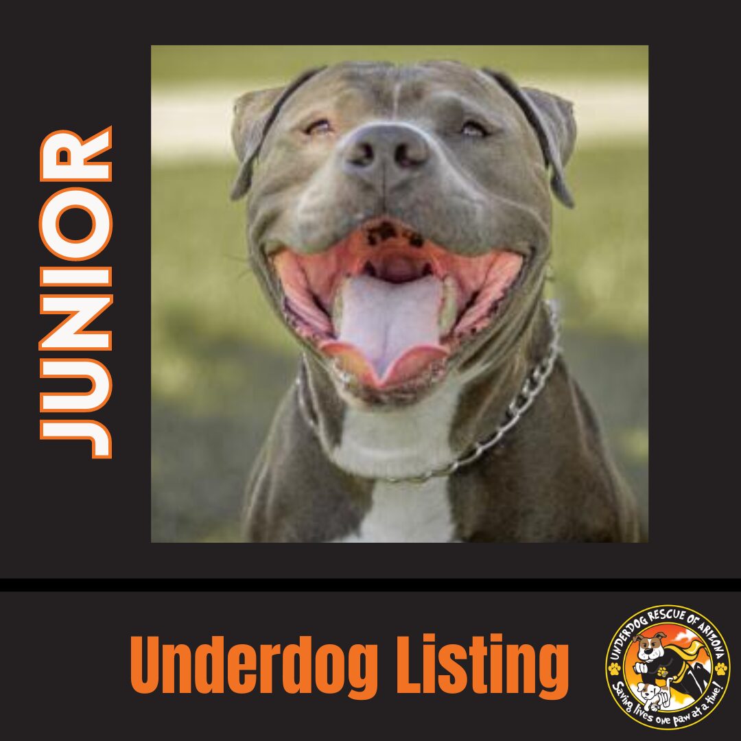 Name: Junior Sex: Male Age: 9 years old Breed: Staffy/Bulldog mix Weight: 80lbs Compatibility with other dogs: dog friendly with proper intros/selective Compatibility with cats: Not good, will chase them Compatibility with kids: Good with older, considerate kids House trained: Yes Spayed/Neutered: Yes Activity level: High Obedience training: Has basic training Personality/Behavior: Leash trained, Crate trained, Does well in a car, Likes to fetch, Likes toys, Lap pet, Playful, Affectionate, Eager to please, Gentle, Goofy Requirements: Meet the whole family; Experienced and strong handler; No dogs or cats in the home; Active home MEET JUNIOR #5!!!!! My name is Junior, I'm 8 years old and a HUGE (80lbs and strong) couch potato! I am a really big guy, but I forget that…a lot! Because of that, I am best in a home with no small children. I might knock them over and not know it, but big kids would work out great! Cats are not my favorite and I will try to chase one if I see it. I don't really like small dogs either (because they remind me of cats), I might be ok with medium or large dogs, but would need an introduction to make sure. I like short walks around the neighborhood and short hikes are okay, as long as I am your main focus, I love attention! Even though I am 80 pounds, I will try to sit in your lap and get cozy. I really just want to find my person and lay beside them all day and have my belly rubbed! My foster mom puts me in my big crate when she goes to work and I'm okay with that. Especially because I get a treat! Let me know if you think you might be my person! If you would like to Junior, please visit our website for our adoption application, www.underdogaz.com or email info@underdogaz.com