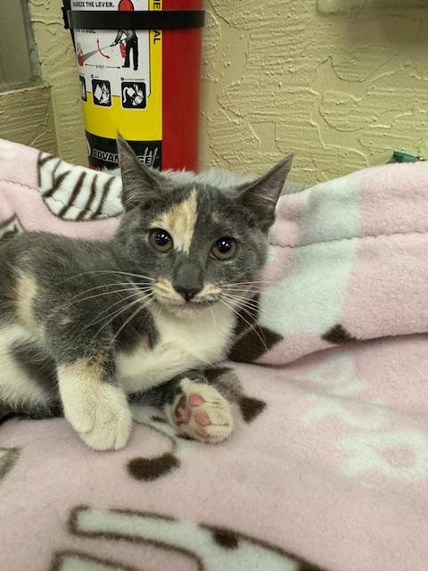 She believes she’s the center of the universe. A smart diva, born with 5 brothers in her litter, she refused to share the crown. No flowers please, the way to her heart is extra gravy treats and canned food. Only after she gets her gifts she may bless you with permission to pet her. She has a lot of energy so be sure to spoil her with toys. A sparkling rhinestone collar would look great with her unique calico markings. For more information & an online application go to https://www.cathouseonthekings.com/adoption/cat.php?id=27184&ts=1761721409&src=rg