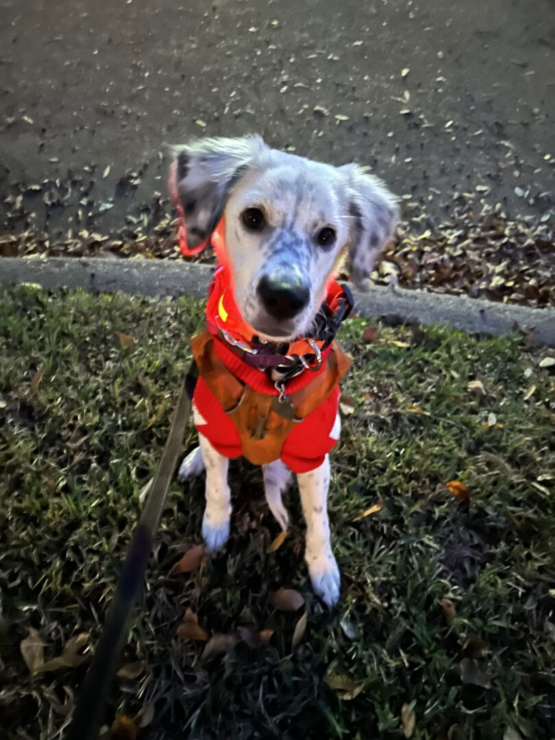 Sweet, happy, timid, soft and sensitive; Kali is about 9 months old and one of the bestest pups you will ever meet. Her story, as far as we know, starts at a shelter in San Antonio TX where she was adopted as a puppy by a family living in an apartment. As she grew over the next few months, her activity level became too much for her current situation and she was listed on a local rehoming FB page and that’s where we found our spotted beauty. She needed a rescue; we saw a fluffy puppy with spots and speculated she might be an English Setter mix. She definitely has the activity level of an ES, she easily logs 50,000+ steps a day on her Fi GPS collar, including daily walks which she loves. Her foster Dad was curious so he ran a DNA test and one of her parents was indeed spotted, but turns out one of those “other spotted dogs”, a Dalmatian. The other parent was mostly San Antonio street dogs with a touch of country dog. Kali is good with other dogs, she loves them but they need to be tolerant of puppy antics and a kiddo that is super friendly and still learning doggy social skills. She’s also good with cats, but she may want to play with them, which some cats won’t like; the cats in her temp foster home were very tolerant of her. She loves people though she can be a bit wary and will bark upon first meeting strangers; she will warm up and bond very quickly. When she knows you, she will shower you with kisses, lots of kisses. Kali is a joy to train, she’s treat motivated and eager to please. She absolutely loves playing with her stuffed toys so that’s a must in her new home. Kali is crate trained and rides well in the car tethered. Her housetraining, with a move to another home, will likely need a refresher and you should be able to give her regular potty breaks and encouragement. Kali will do best in a home with another active and playful dog and that will also help her expend some of her puppy energy. A medium sized fenced yard is a must for this active girl. She’d like a person that is home a lot so she can get out for regular romps and potty breaks in the yard. She’s going to want her person outside with her. Kali has lived with small children though she is still a mouthy puppy and should be expected to take food from a child and steal their toys so she will do better with 9+ year old children. Kali is about as perfect as you could expect a puppy to be and will be a joy for the right active person/family.
