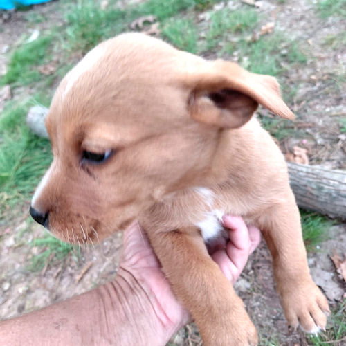 Karma is a female tan-and-white border collie/lab/bulldog mix, born on February 13, 2026. She is dark tan with droopy jowls and droopy ears. She has a white chest and a white blaze.Karma is a little mischievous girl with high energy. She loves to keep her litter mates playing, even when they are ready to quit. Karma had her first vaccine and deworming on April 2. She will be due her second vaccine on April 22. Sandy can be adopted locally right away, but she cannot travel out of state until April 24, after her second vaccine. She can be pre-adopted, but adopters will have to wait for her. The adoption fee is $325. This covers the cost of spay/neuter, DHPP, Rabies, Flea, tick, heart worm check, worm treatment, and microchip. To adopt, you need to first fill out an application. Go to: https://rutherfordcountyhumanesociety.org/dog-adoption-application/ We are located in Western North Carolina. Optional transport is weekly. After your application is approved, we will contact you regarding cost and delivery if you so desire.