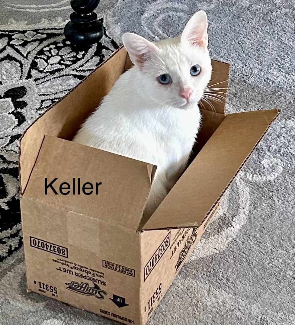 See Keller’s HomepageGo to our official website Hi, my name is Keller and I’m a beautiful little shorthaired pure white boy with bright blue eyes! It’s a beautiful combination, but typically that combination means a deaf kitty! And that’s me… I can’t hear a thing! Helen is my sister, a couple years older than me a nd she is my “hearing cat”. I could not live without her. She has been with me all my life. Sometimes we spat at each other, but that’s typical of siblings anyway. When we were first rescued, we were very nervous kitties and not sure what to think of being inside as we were outdoor kitties prior to that . With my lack of hearing, I could easily have been killed by a car or another animal without even knowing it was going to happen, so the people who rescued us knew we had to go to a rescue that would get us healthy, keep us safe and find us a good home! We have acclimated wonderfully! We’d love to be on the couch with you and on your lap and be petted and scratched, and Pampered! Check out our video! Would you consider giving me and Helen our forever home? We will love you forever! Love, Keller! If interested, please fill out our application at bit.ly/7whskrs