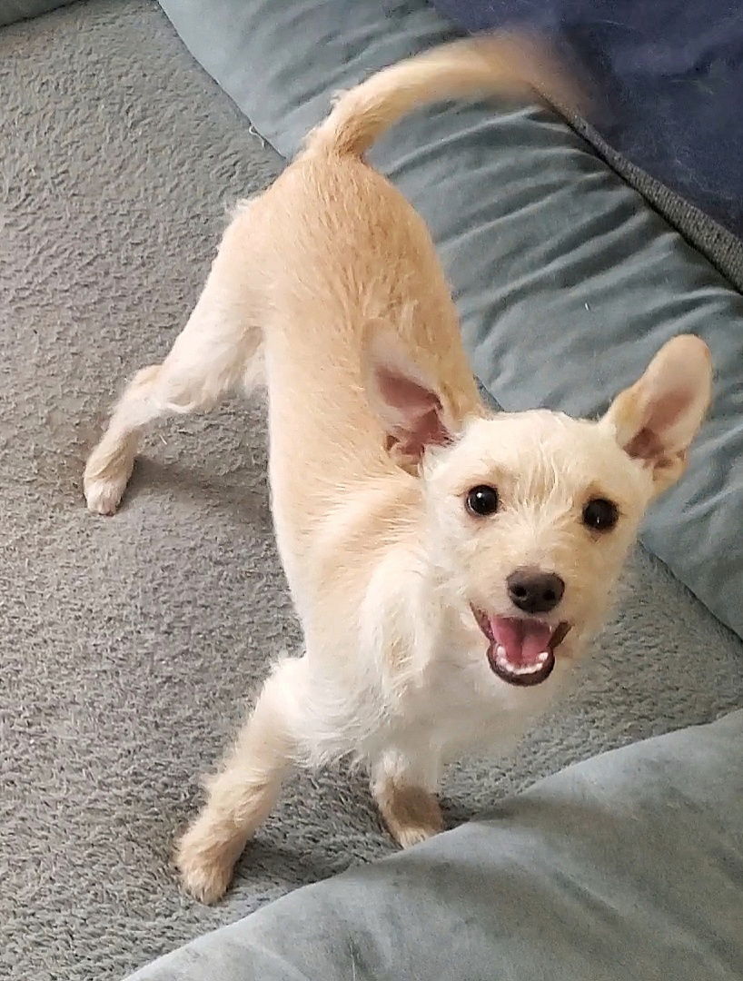This cute little boy is only 5 mo old and is still learning the world. He is the sweetest pup who wants to make friends, but he is very shy at first. He submissively crawls over to our dogs and gives them kisses, hoping for their approval. When they give in and start to play, Kirby will wrestle with them for hours! He would love a buddy in his next home. Like your typical puppy, Kirby is clumsy and adorable! He plays hard and then naps, snuggled up close to his people. He loves being held also! Kirby hasn’t been around cats yet, but we think he would do fine with them. However, we do feel a home with older or no kids would be best. We are working on housebreaking Kirby, but he isn’t fully there yet. He is also still figuring out the crate. He came in with his mom, Eve, so he is used to constant company and is just now learning how to be more independent. We have seen some progress, but he needs more training to feel comfortable on his own. Kirby is neutered, vaccinated and microchipped. His mom is a 6lb Terrier. We don’t know his dad, but Kirby is currently 10lbs at 5 mo. We guess he will be somewhere between 12 and 15lbs as an adult. If you’re interested in adopting Kirby, please submit an application on our website at www.dominoeffectanimalrescue.org