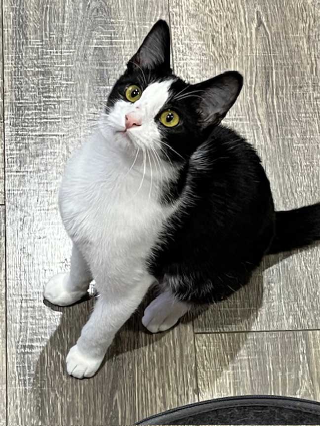The soft, melodic sound of the name “Naomi” means “pleasantness”. How appropriately named is this little girl!?? This adorable black and white kitten, with those white whiskers and that pink button nose, arrived at my home with dermatitis and a sinus infection. She is such a friendly kitten that her minor infections do not slow her down. Kisses, please! Naomi actually reaches her paws straight up, as if asking to come on up! It is so adorable! You cannot help but oblige. If you are not a fan of your kitten climbing up your chest to get up close and personal for head butts and kisses, Naomi is not for you. And if you bend down, that is her invitation to step upon your back, to proceed to make biscuits on your head. How can you not chuckle at that? She is simply enticed with heads. If you have broad shoulders, you will soon have a cat-hat! She has got to get up and personal, and check out your hair. All along, her loud motor is purring. She even makes biscuits while eating. Left paw up, right paw up, while enjoying lunch. She is simply one of the most affectionate kittens I have ever fostered! I don’t ever want to leave her alone in her room, especially when she paws at the closed door and lets up the most delicate little, high pitched kitten cry. Mee-oow! Meee! Now! I quickly turn and go right back in for more sweet kisses and love bites. Naomi, who was born in May 2024, is now mingling with two younger four month old foster kittens. She looks and behaves like a six month old! Being the oldest, and a little larger, after a few take downs and foster mama telling her no, she quickly learns that she has to be gentle with the young kittens. Naomi has definitely learned how to play well with others. They are now all three wrestling buddies! After a few somersaults and a bunch of bunny kicks, it is time for the next toy. Naomi likes to grab the wanded toy with the 3 fish on the end, and dash away, with the fish trailing behind. This is, of course, irresistible for the two kittens, and the chase is on. Next, it is time to tackle the 3-tier interactive ball toy. Fun for all! Bat, bat, bat! Hours of fun for all. Naomi is four paws of fur, purr, love and fun. Are you ready for unconditional love? Do you like little love bites? Are you ready to go fishing for a cat with a wand? Then Naomi is ready for you. Don’t let this little love “swim” away! Please write to Critter Cavalry Rescue about this precious little girl and we will answer you immediately. ccrnewengland@gmail.com Our vetting is extensive: Spay, rabies, FIV vaccine, FIV tested and negative, fecal and dewormings and a Drontal and microchipped. PLEASE NOTE: Our dogs and cats are fostered in Tennessee and can transport weekly up to the Northeast region. Request an application and learn more about Critter Cavalry at https://www.crittercavalry.com/adoption.
